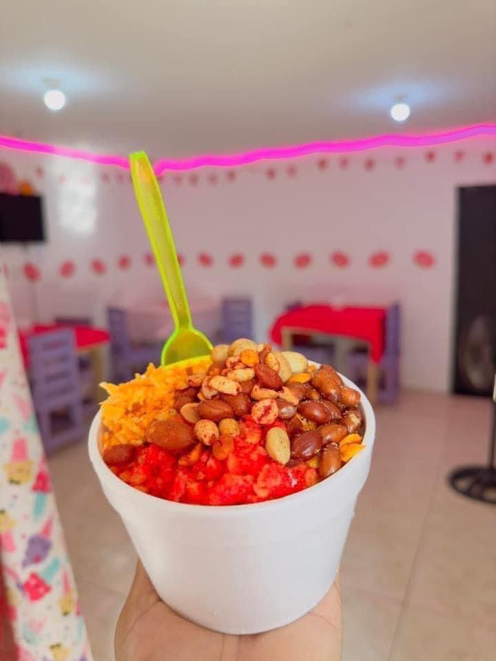 Elote desgranado, mayonesa, chile, limón, queso fresco, queso amarillo, cacahuate, sabritas a elección.