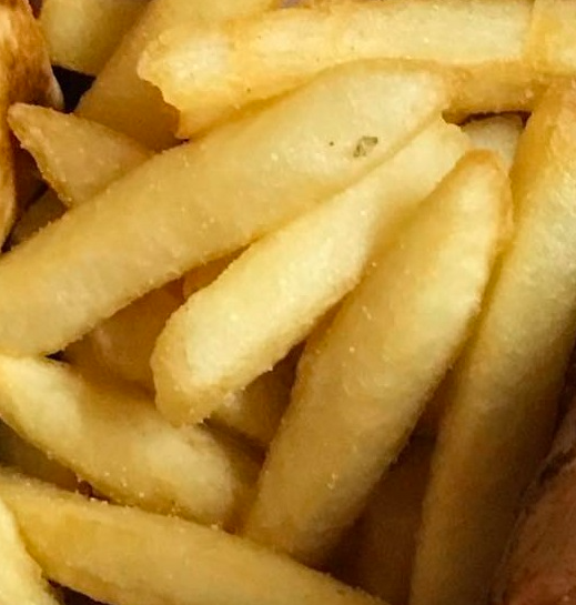 costillas de puerco asadas bañadas en salsa BBQ, acompañadas con papas a la francesa y elote amarillo