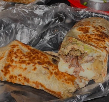 tortilla de harina, con carne asada, queso gratinado y guacamole