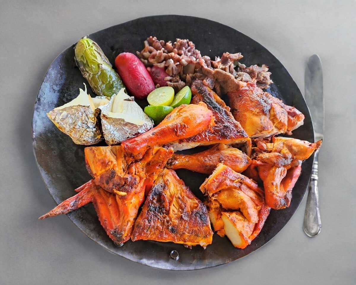 1 pollo entero, 1/2 orden de carne asada, 1 salchicha y 1 cebolla.