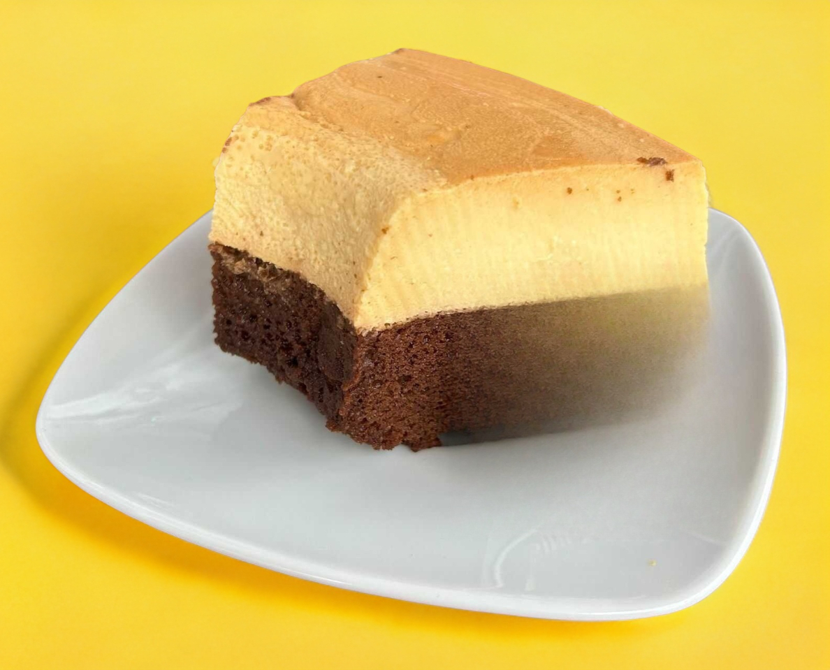 Exquisito Flan Cake de vainilla con pan de chocolate.