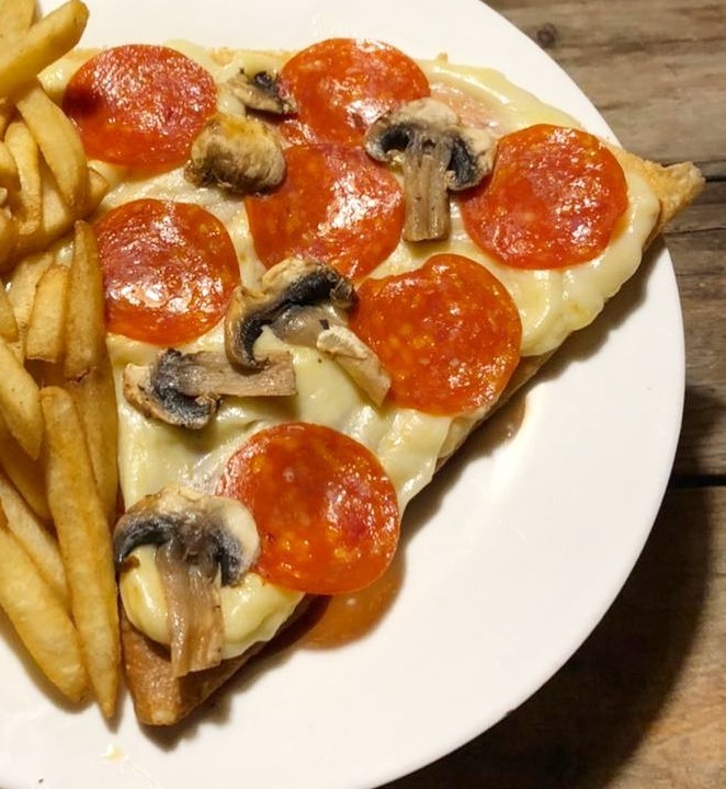Salsa de tomate, queso gratinado, champiñones y pepperoni o jamón.