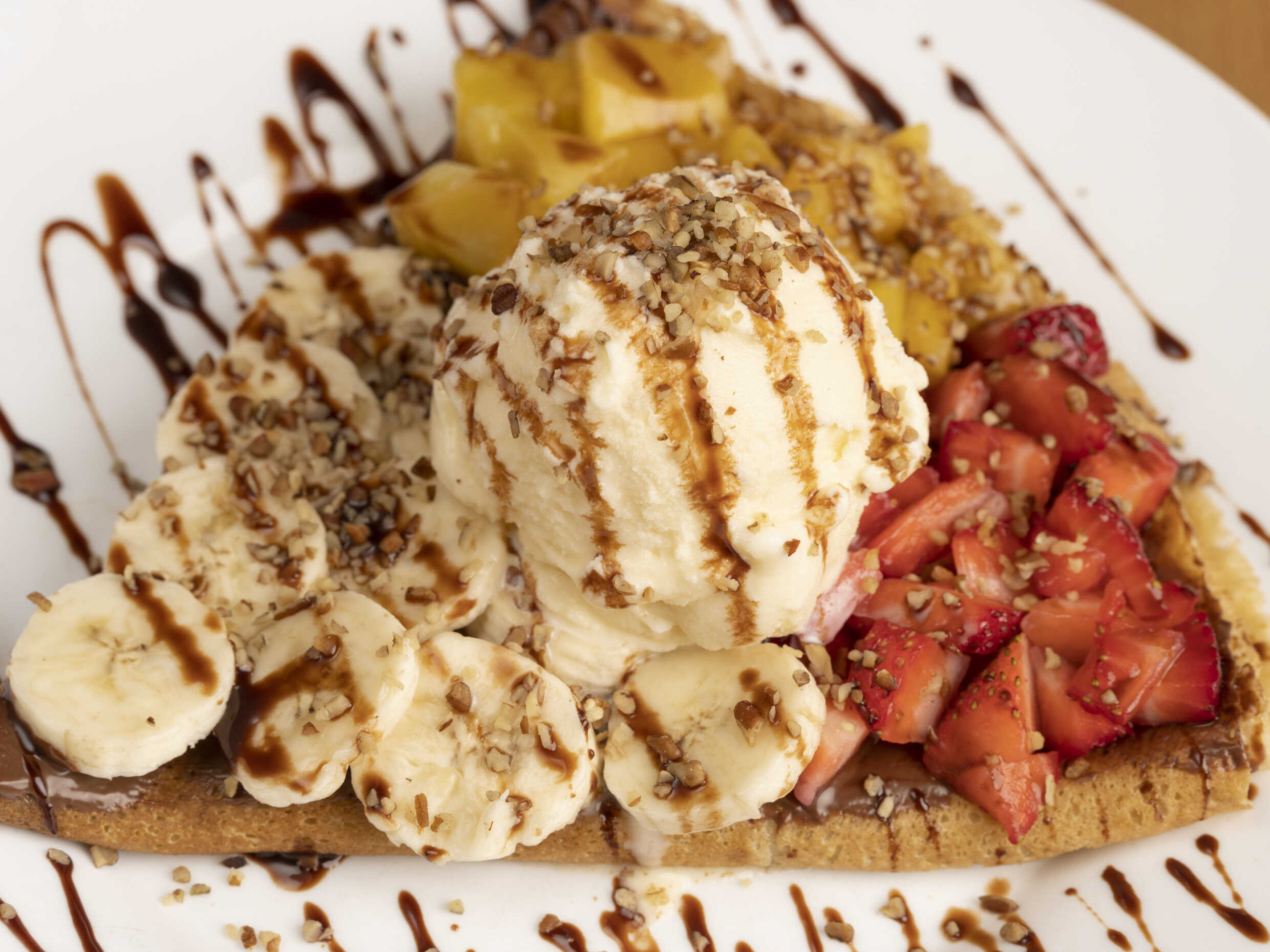 Philadelphia, plátano, Nutella, helado de vainilla y chocolate Kranky. Elígela en tu opción favorita, waffle, crepa o hot-cakes.