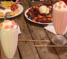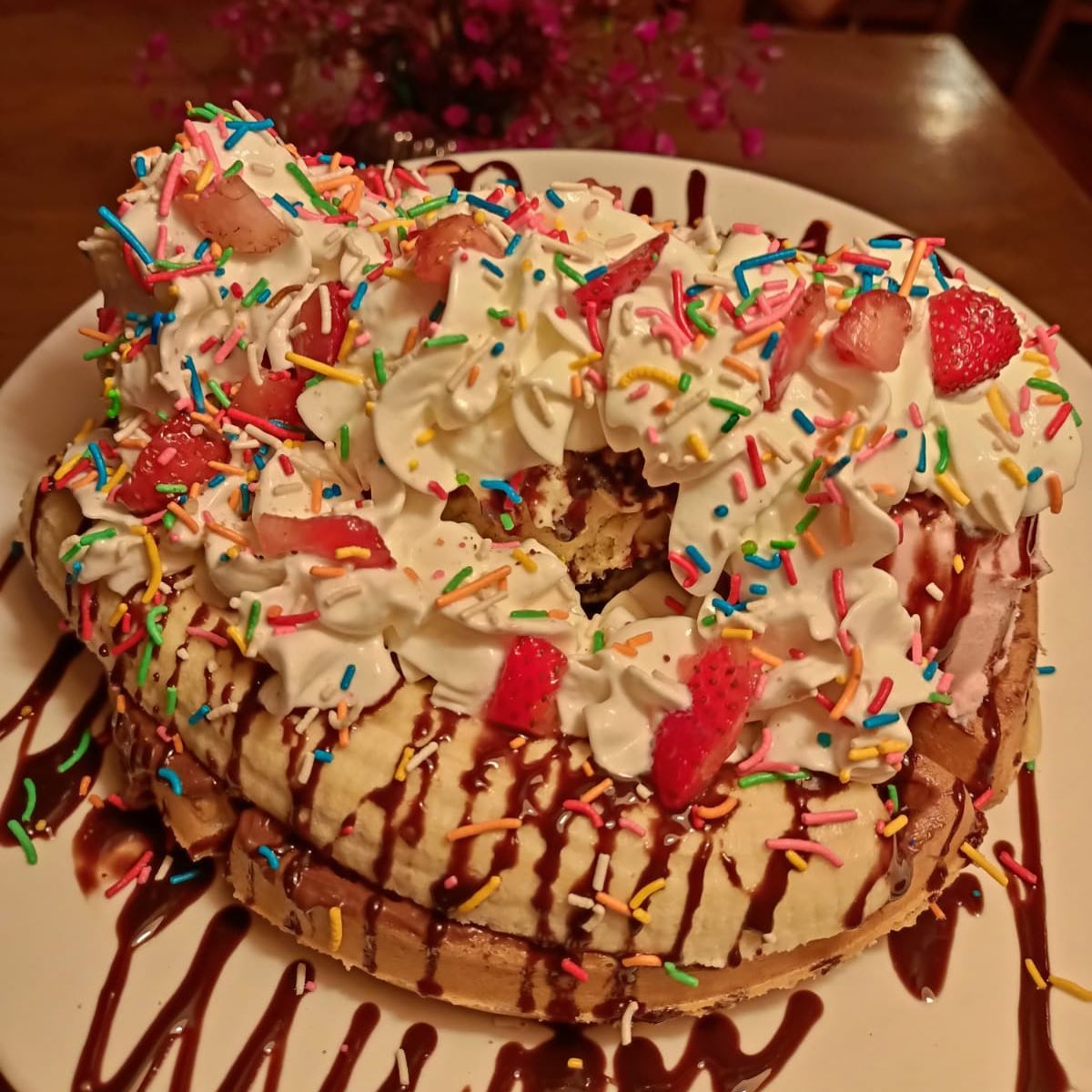 Nutella, plátano, 3 bolas de helado, Hershey´s, chantillí, fresa y grajeas de colores, Elige una de tus opciones favoritas ya sea en waffle, crepa o hot-cakes.