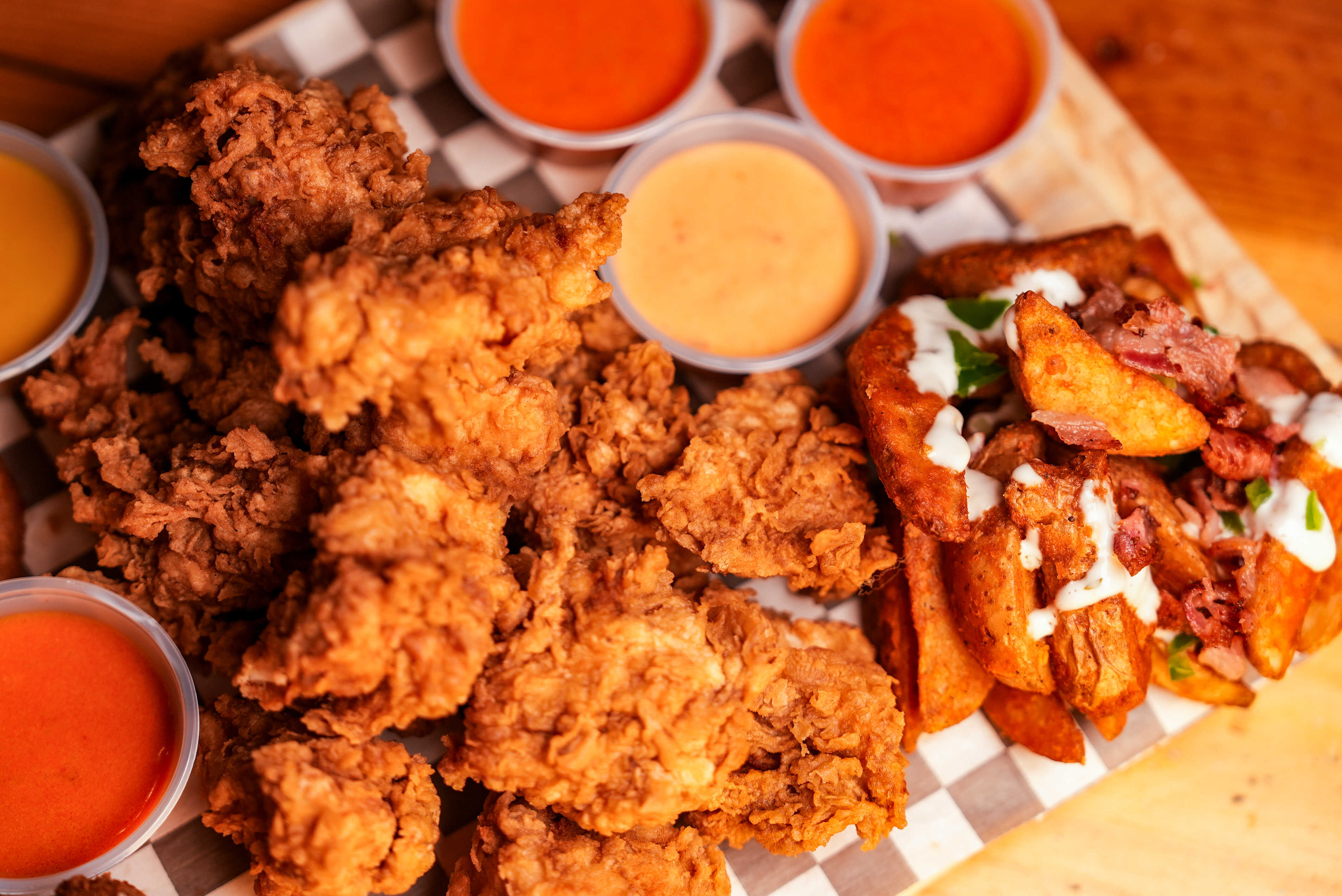 6 BONELESS EMPANIZADOS ACOMPAÑADOS DE ADEREZO Y VEGETALES, BAÑADOS EN SALSA A ELEGIR + Papas Gajo.