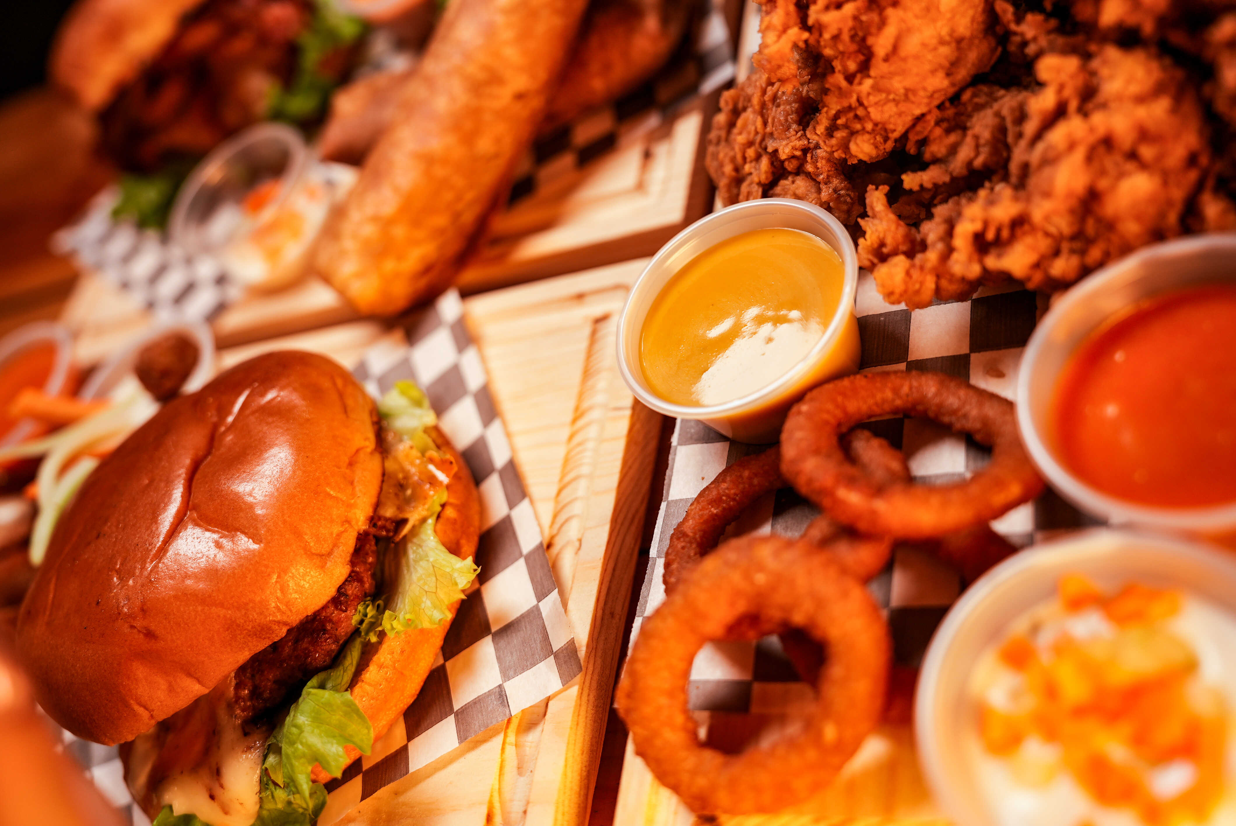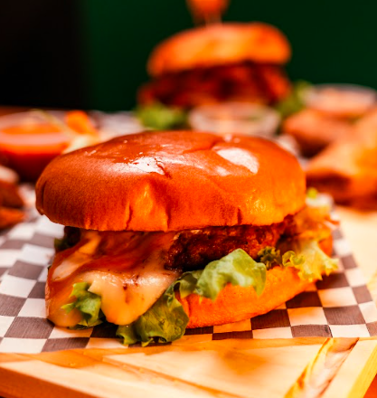 HAMBURUESA TEXANA DE CARNE DE SIRLON DE RES, ACOMPAÑADA DE VEGETALES COMO TOMATE, LECHUGA, CEBOLLA, QUESO, Y CON ADEREZOS DE MAYONESA, CATSUP, AROS DE CEBOLLA Y SALSA BBQ