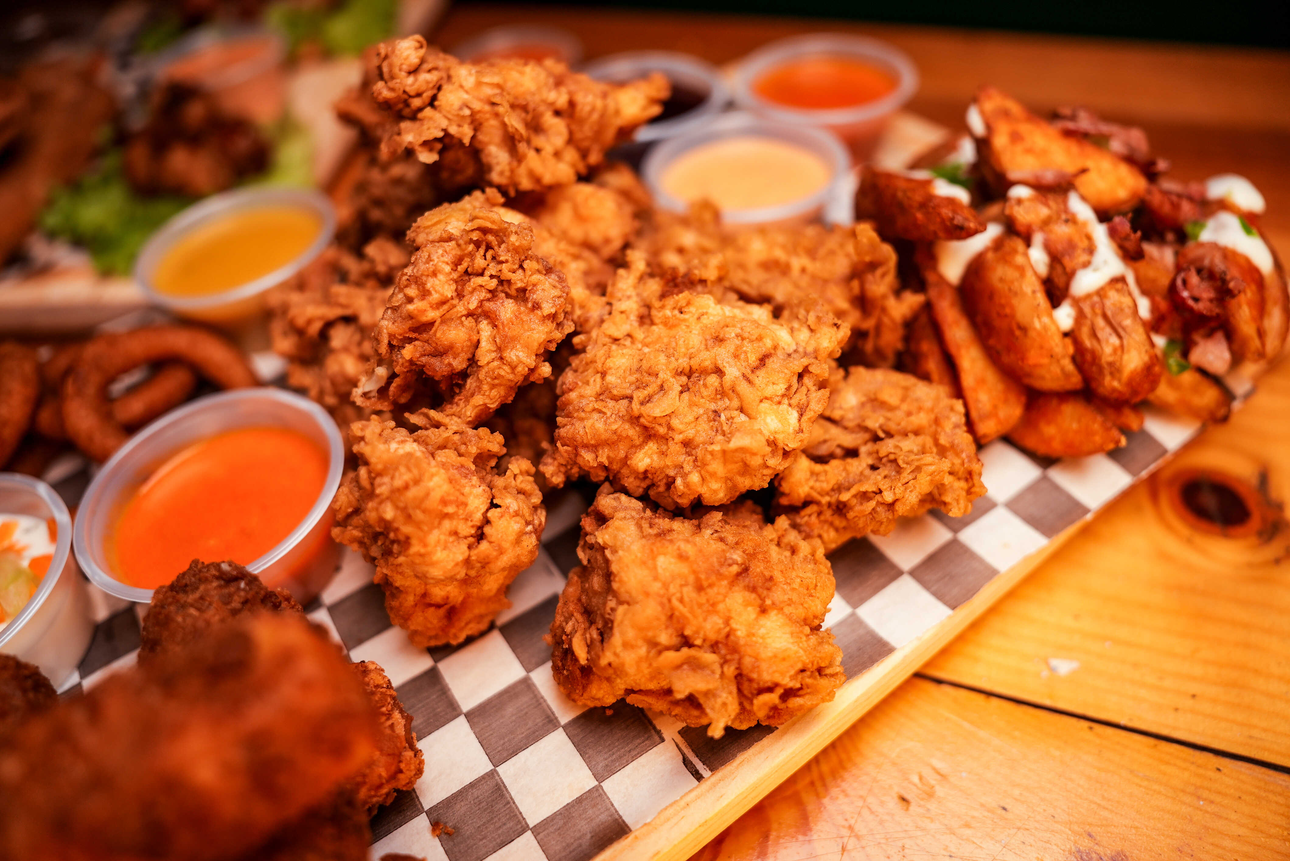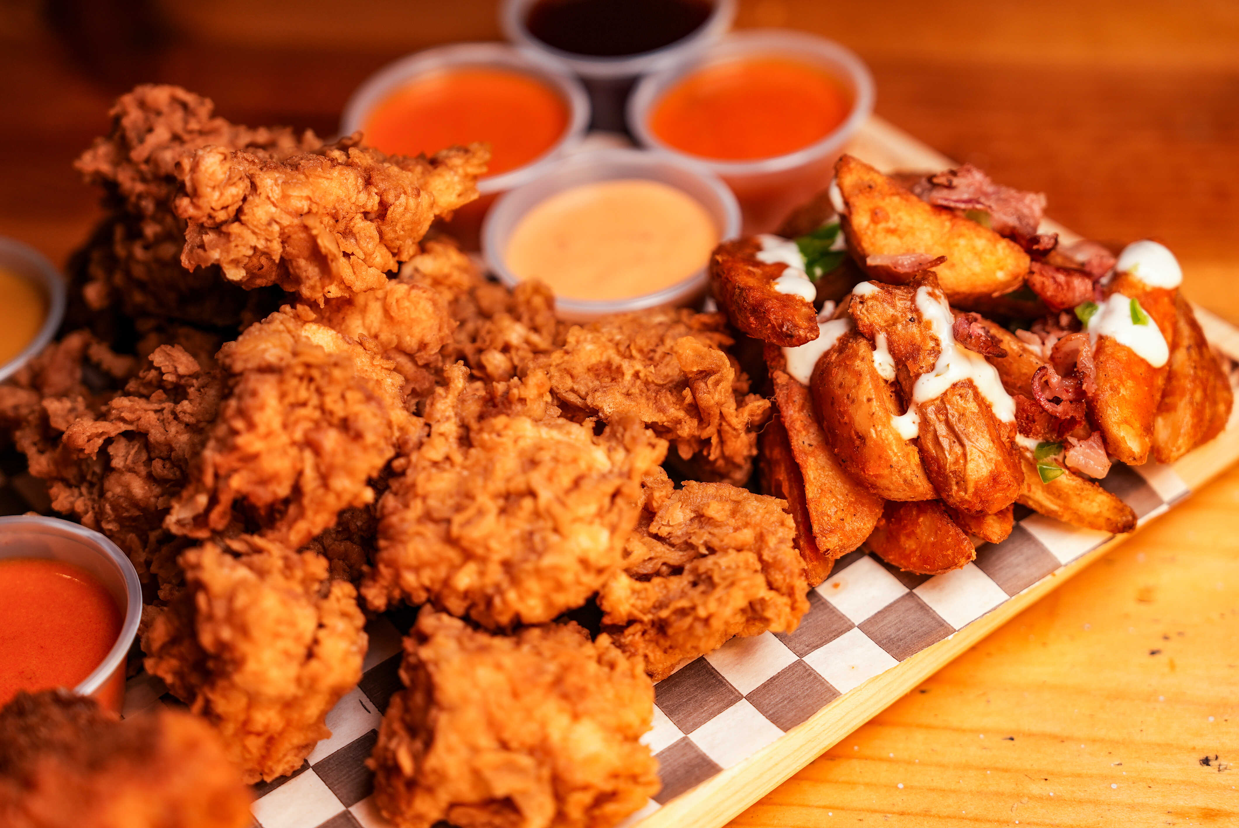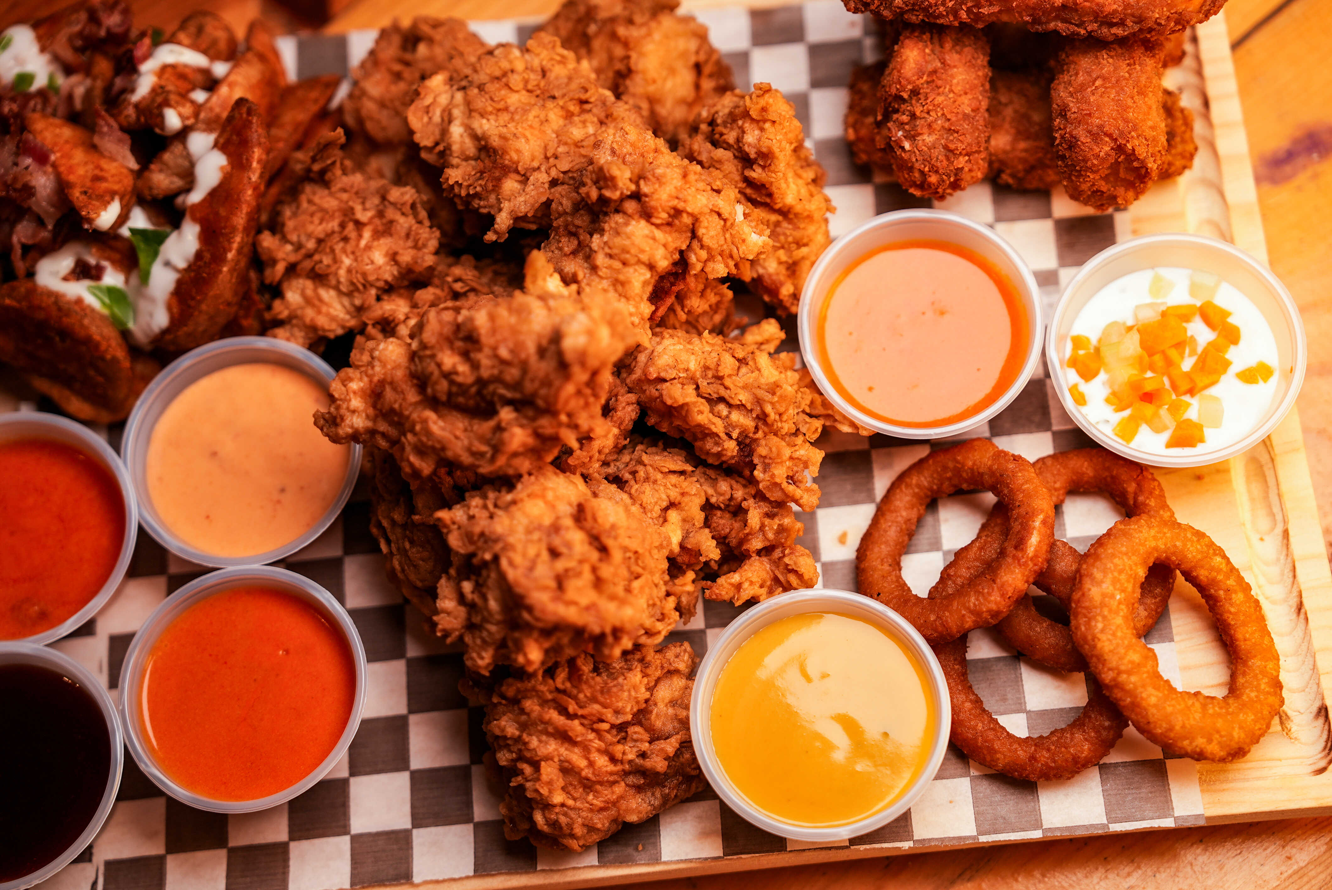 20 Boneless más jugosos, más crujientes y más grandes. Para completar la experiencia elige tú salsa favorita (Disfruta de las nuevas salsas de la casa) Incluye papas gajo y verduras.