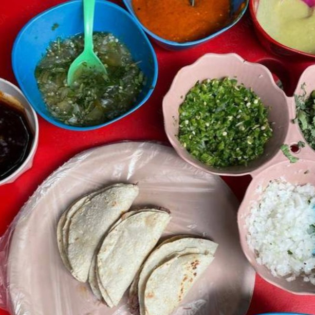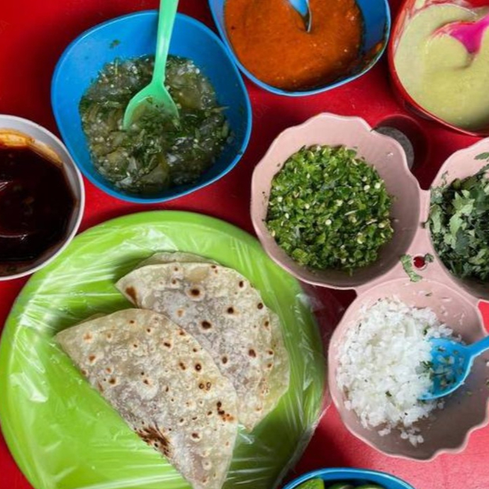 Tortillas de harina acompañadas de barbacoa, cebolla, cilantro y salsas verde (de la casa), roja, salsa de tomatillo y matcha.