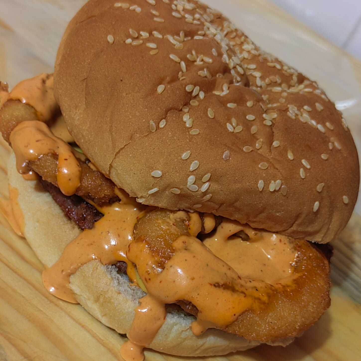 Carne, aros de cebolla, tocino, y aderezo de chipotle.