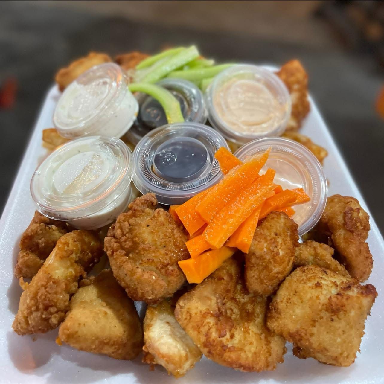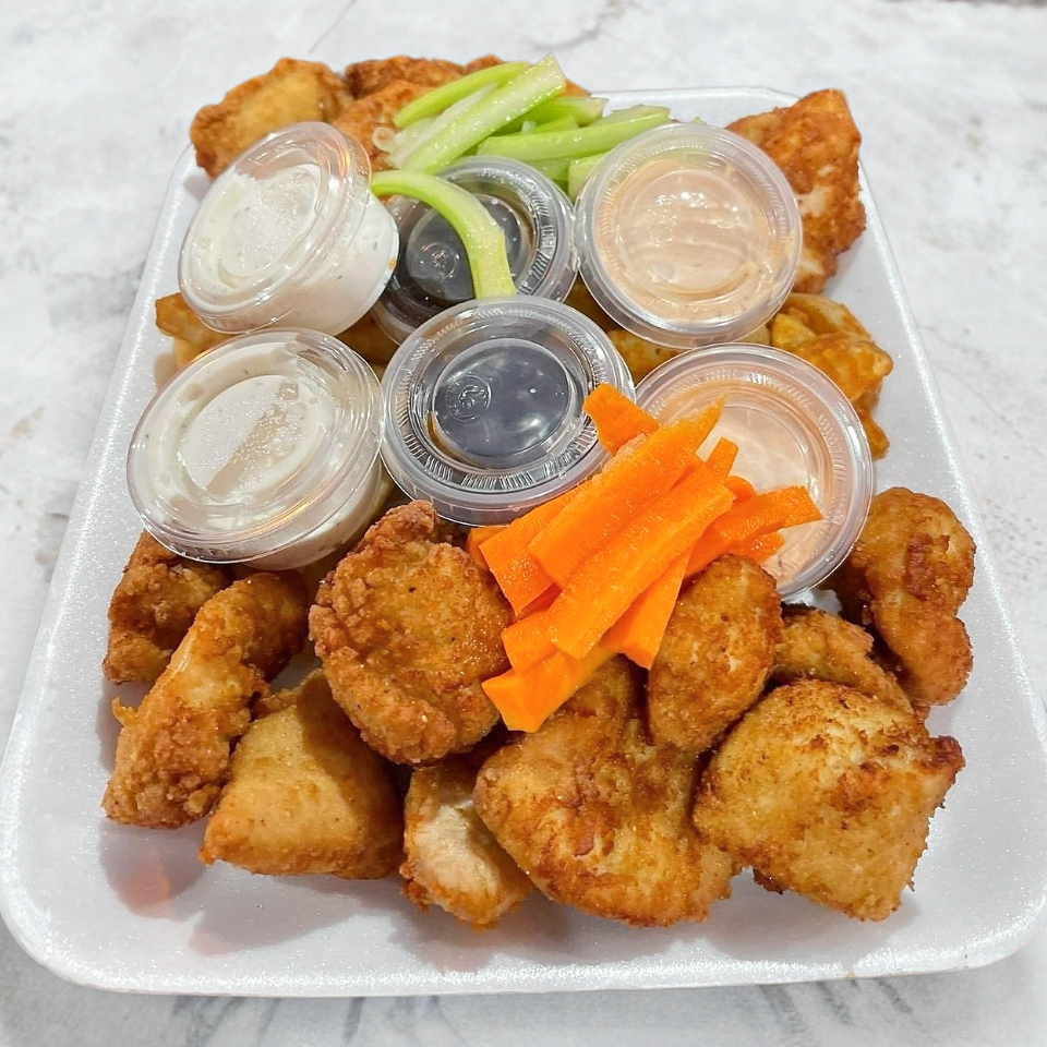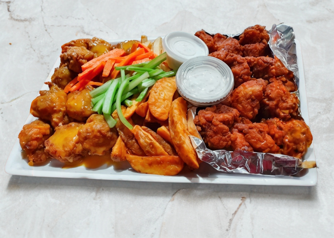 Gran charola de boneless con 25 piezas, acompañada de papas en gajo, papas a la francesa, dos aderezos y cuatro salsas.