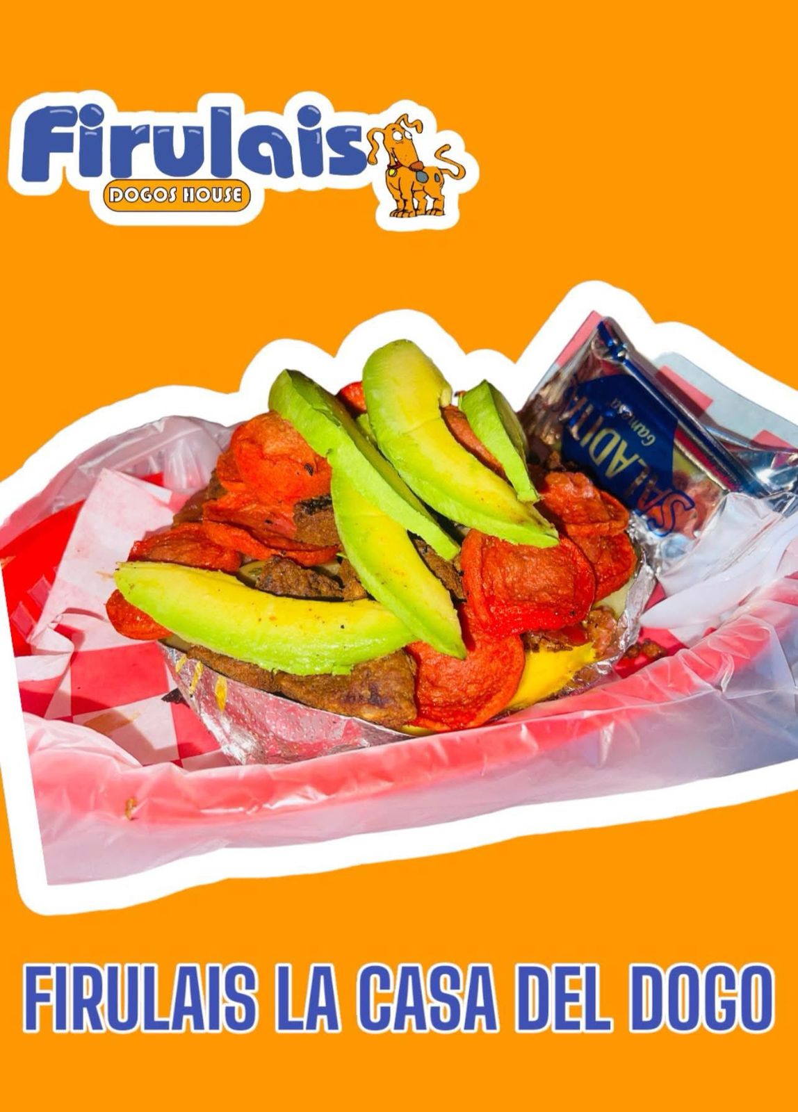 Con carne, jamón, tres quesos, tocino, salchicha para asar y aguacate.