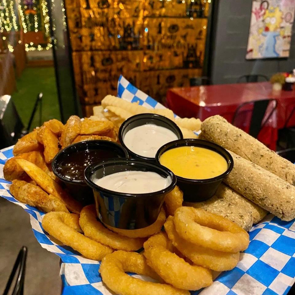 5 Dedos de queso, papas gajo, 8 aros de cebolla, papas a la francesa, 2 aderezos y 2 salsas.