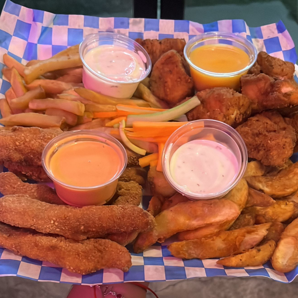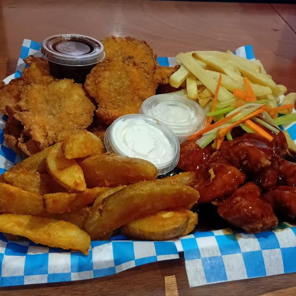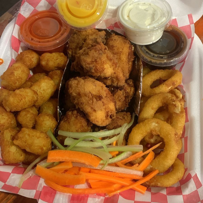 Papas crisscut, 8 boneless, 8 aros de cebolla, bolitas de papa, 2 salsas y 2 aderezos.