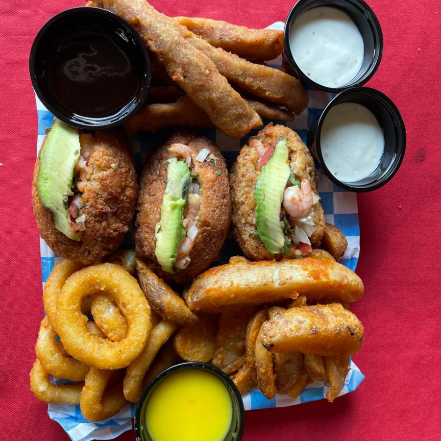 6 Tiras de pescado, 8 aros de cebolla, 3 jaibas rellenas de camarón, papas francesas, 2 salsas, papas gajo y 2 aderezos.