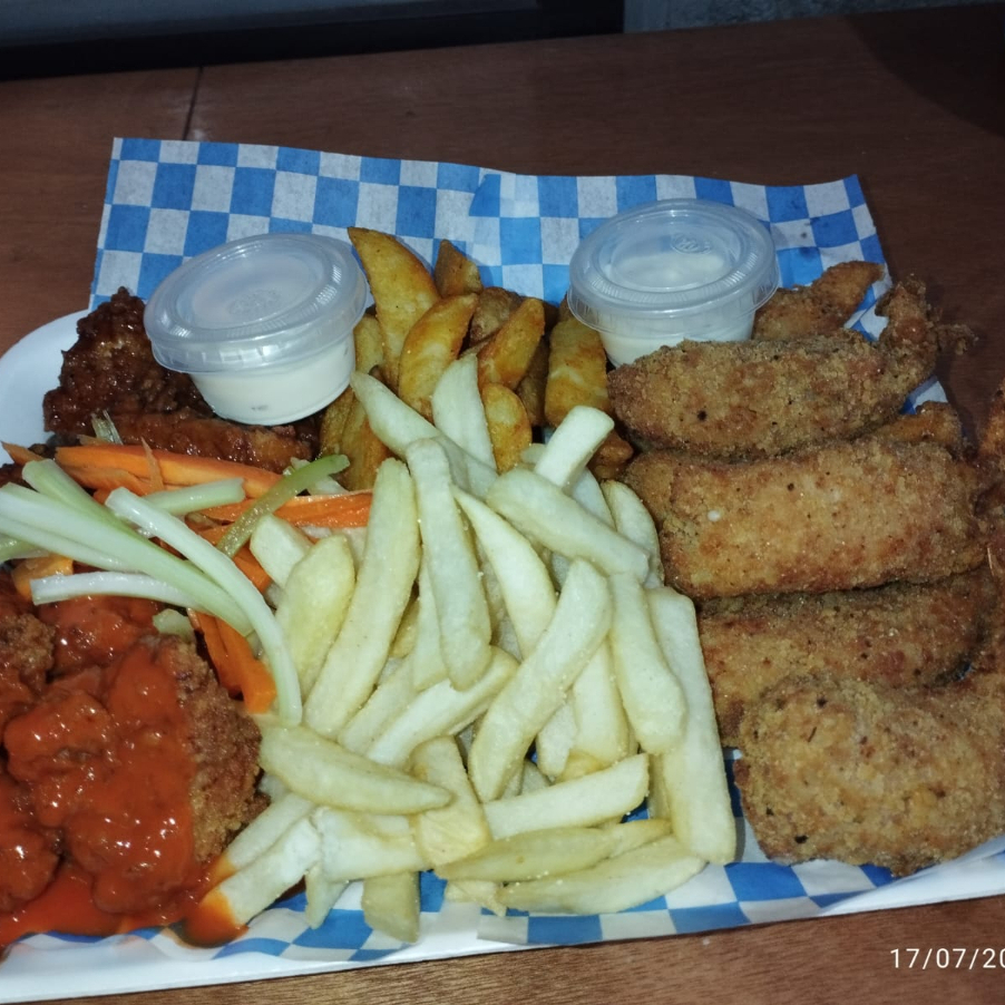 6 Tiras de pollo, 8 aros de cebolla, 5 dedos de queso, papas francesas, papas gajo, 2 salsas y 2 aderezos.