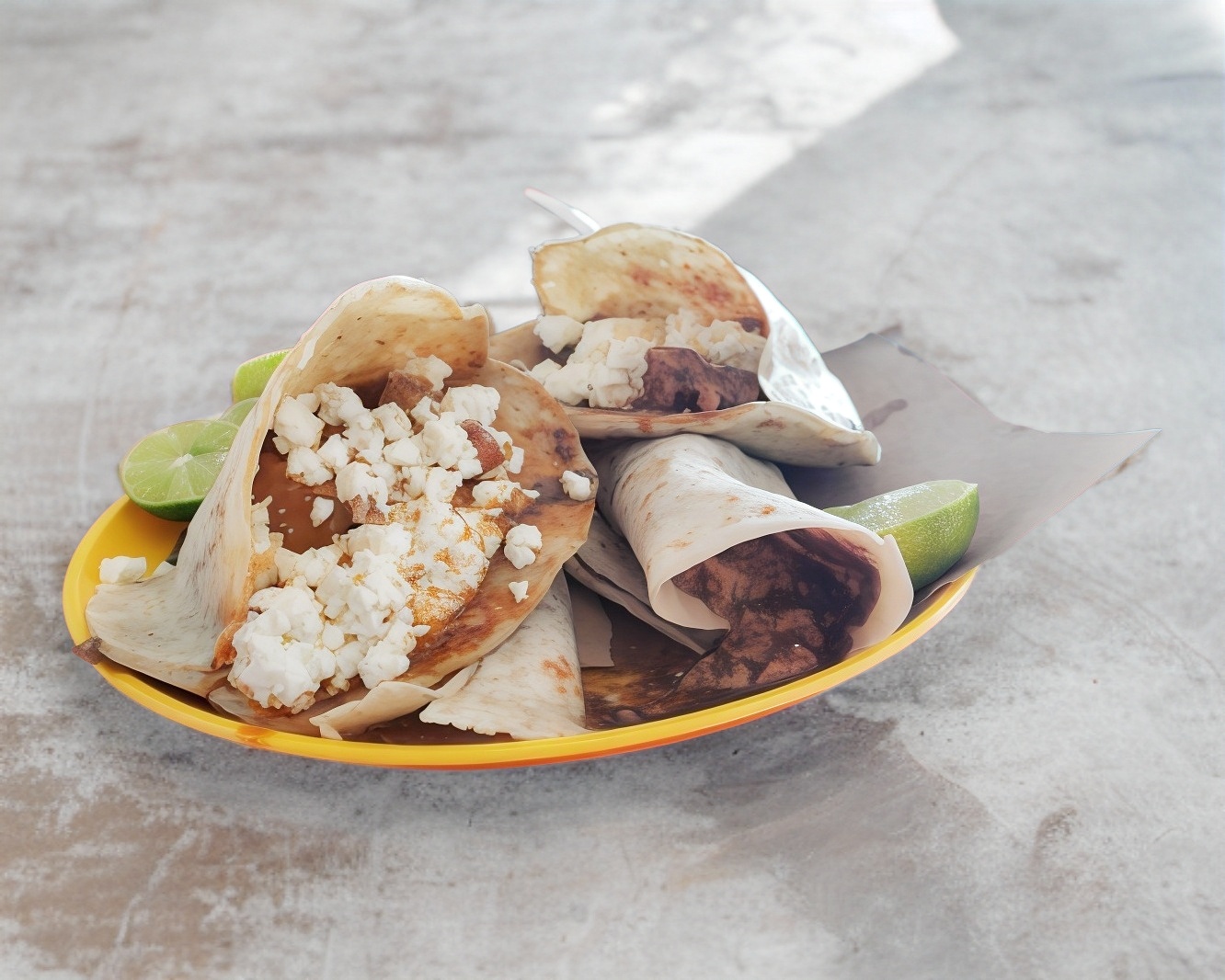 Tortilla de maíz revolcada o frita, opcionalmente con queso y frijoles y 1 guiso a elegir.