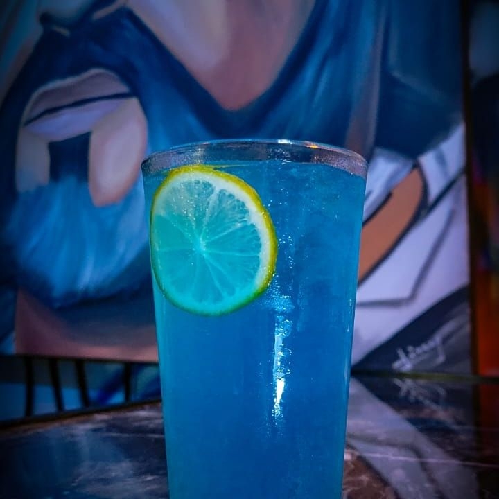 Limonada mineral con curazao sin alcohol y lima.