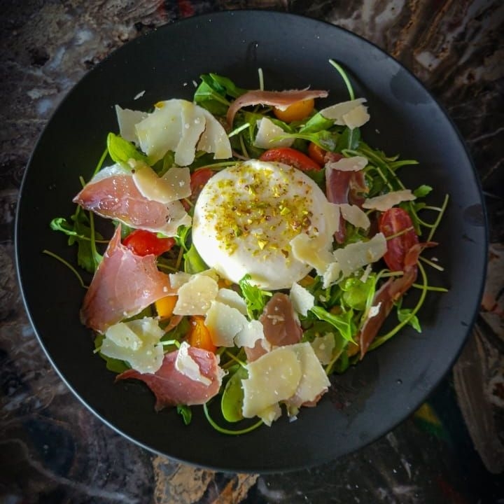 Burrata, arúgula, parmesano, cherry, jamón serrano y vinagreta de la casa.