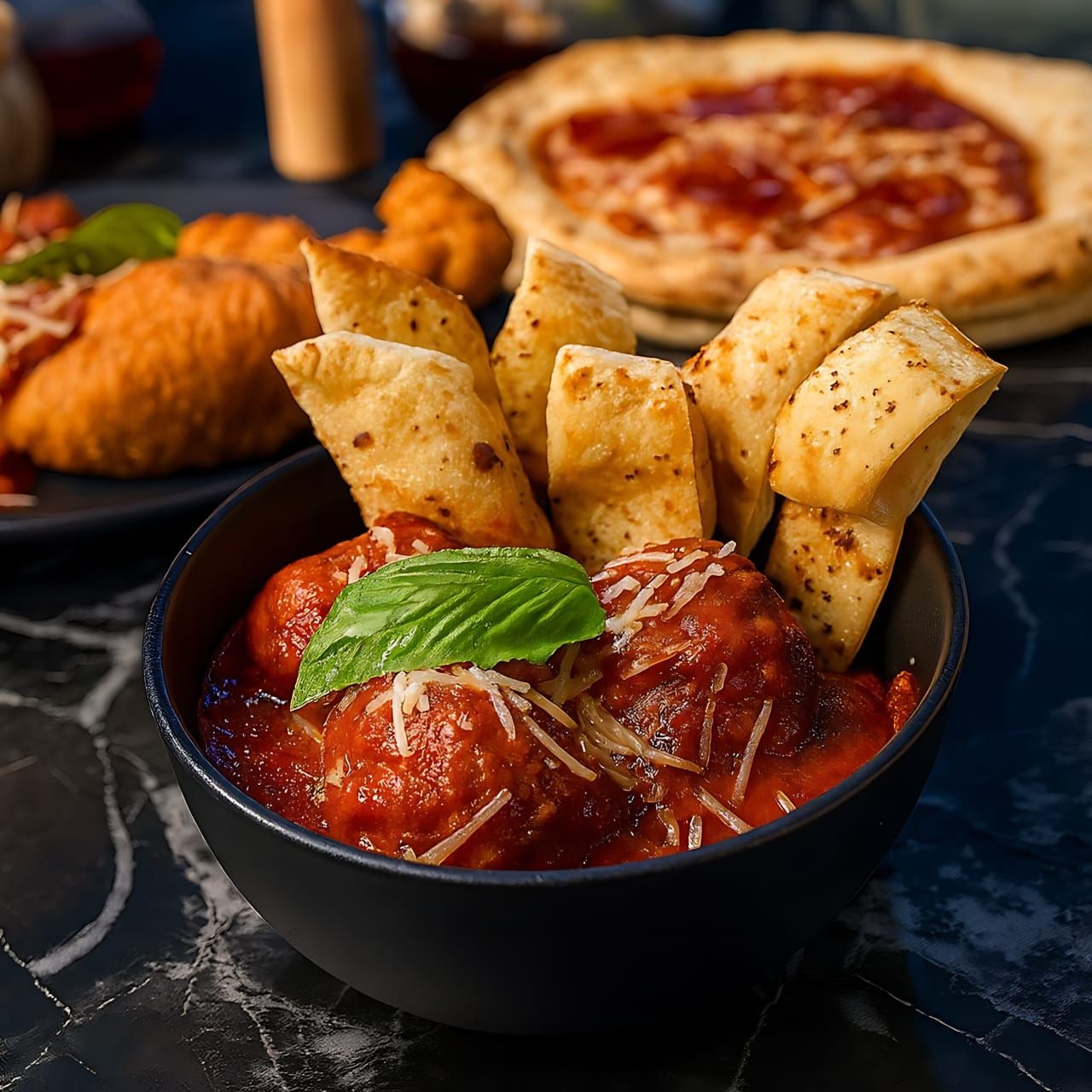3 Albóndigas tradicionales en salsa de la casa con parmesano y pan focaccia.