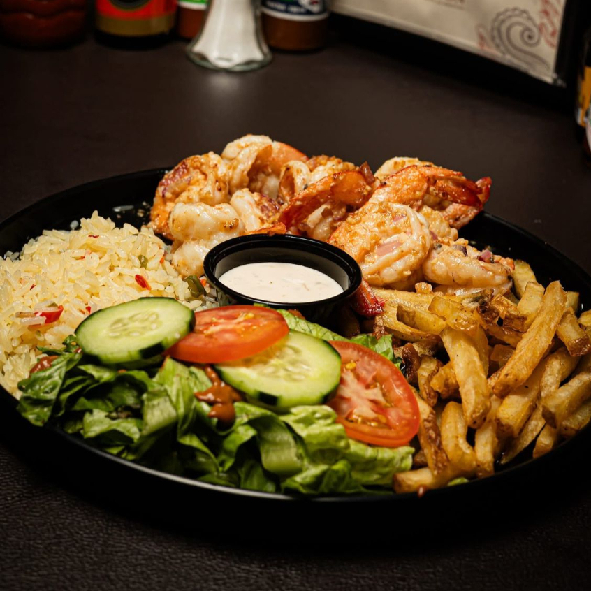 Camarones, Acompañado de Arroz, Pan, Cebolla y Cilantro