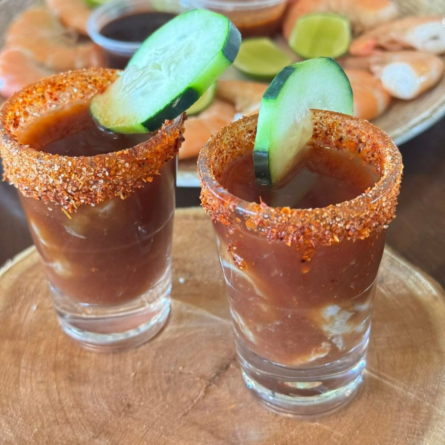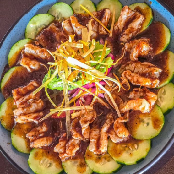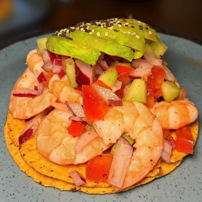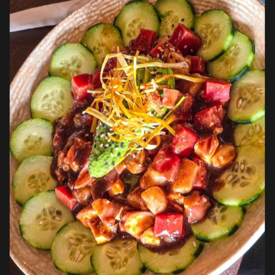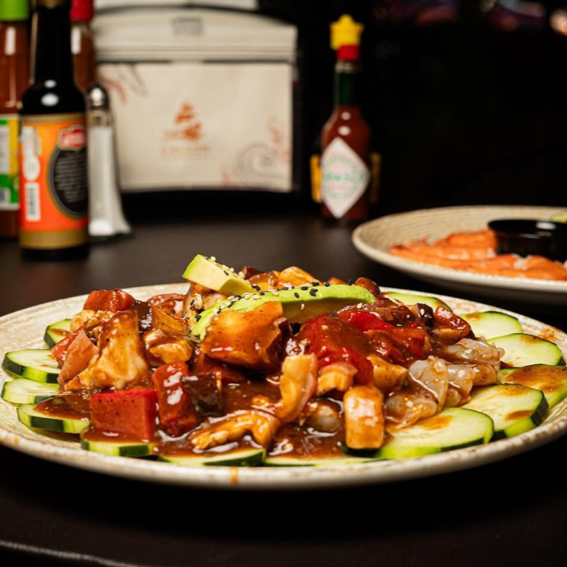 Camarón, Pulpo, Atún, Callo deHacha, Cebolla, Pepino, Aguacate, Bañado en salsa marisquera de la casa