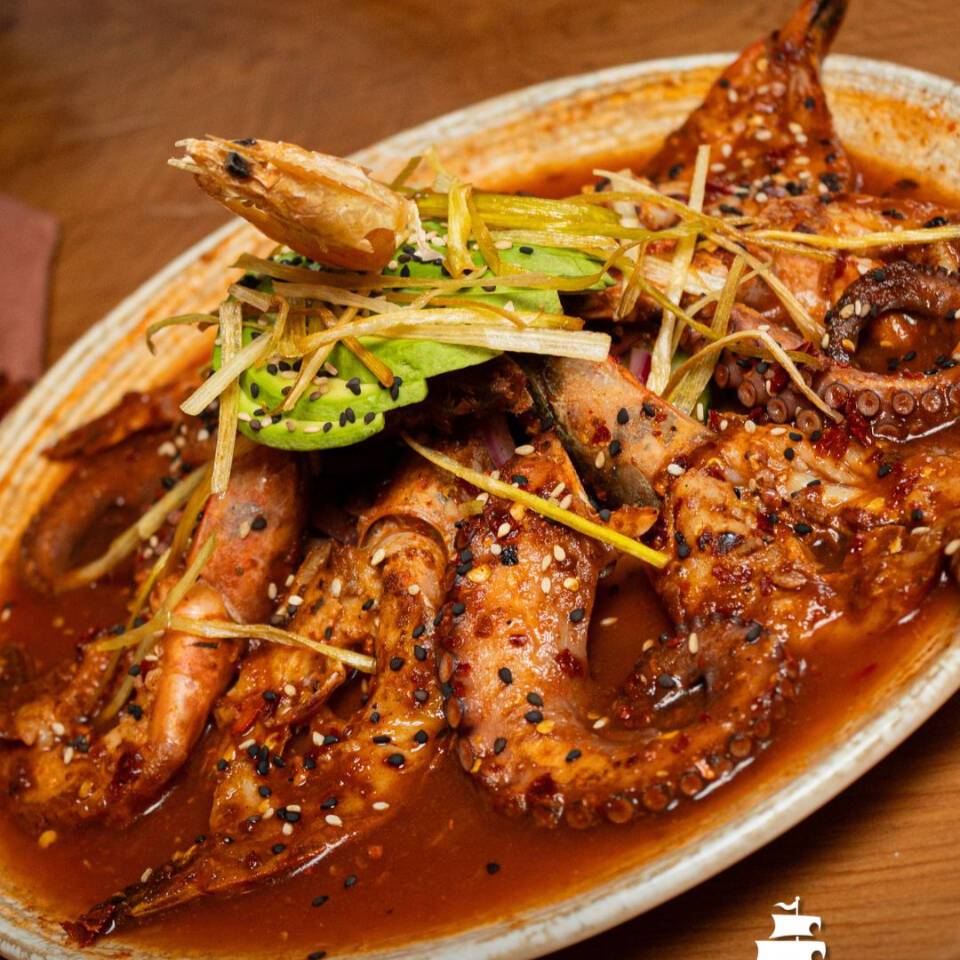 Al mero estilo del norte, Camarones y pulpo asados bañados en salsa roja, Acompañado de pepino, cebolla y aguacate.