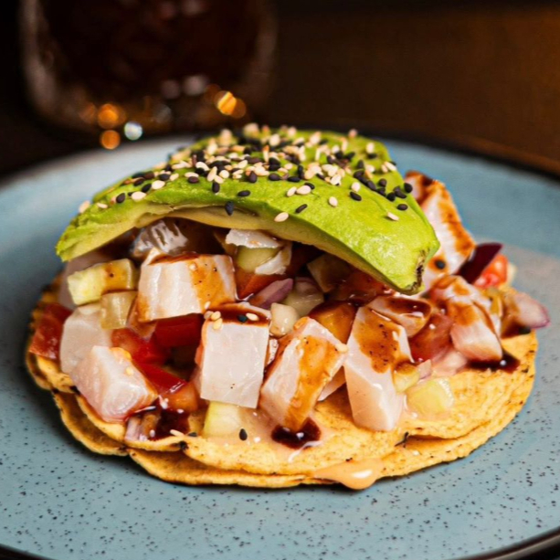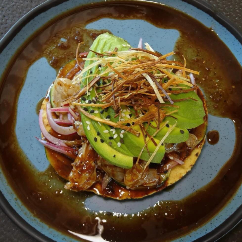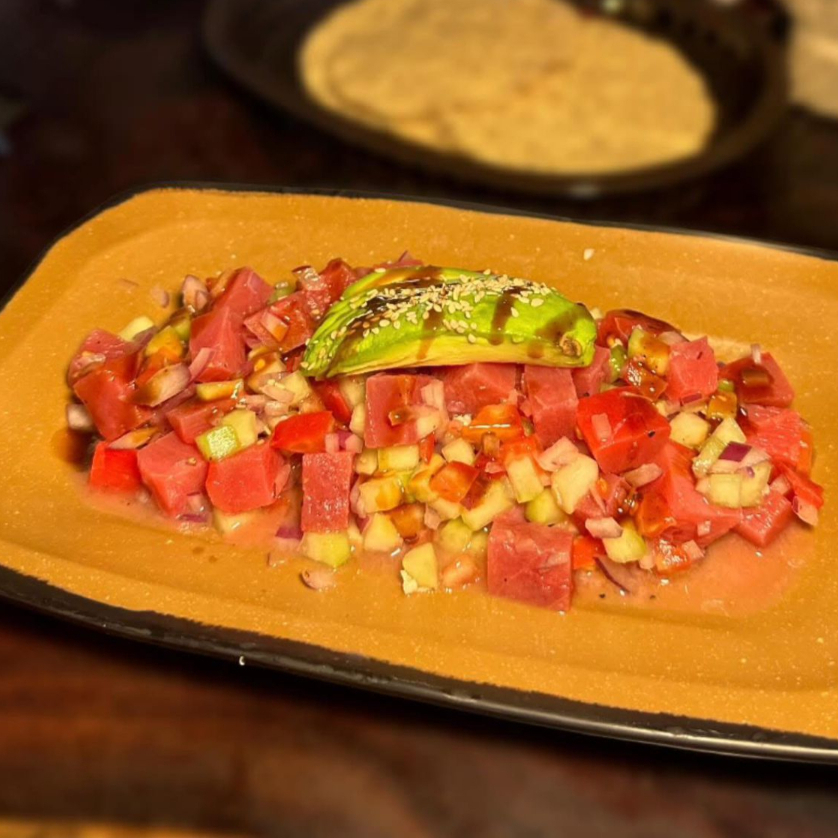 Trocitos de atún Fritos, servido con cebolla curtida con habanero y guacamole