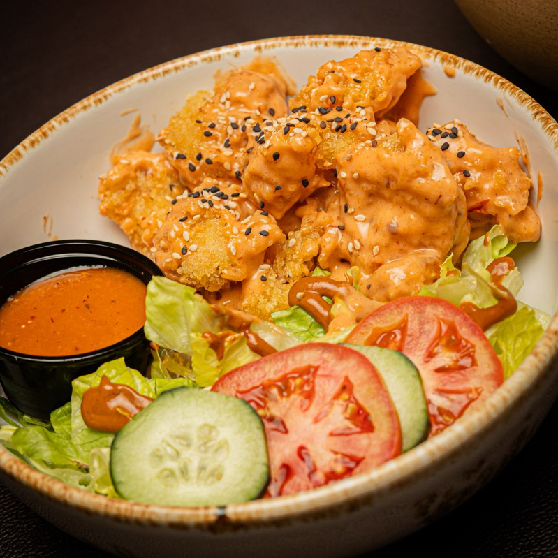 Camarones crujientes, Bañados en una salsa cremosa y ligeramente picante, Acompañados de ensalada.