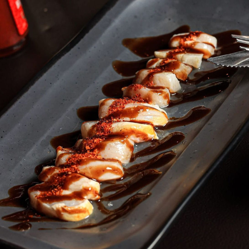 350grde rib-eye bañados en salsa de habanero tatemado, acompañado de cebolla, Cilantro, Aguacate y chiltepín