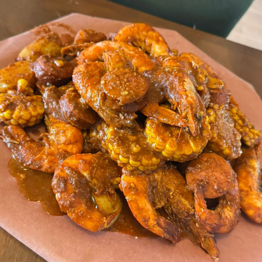 Camarón, Papa, Elote, Salchichapolaca, Bañados en salsa cajún.