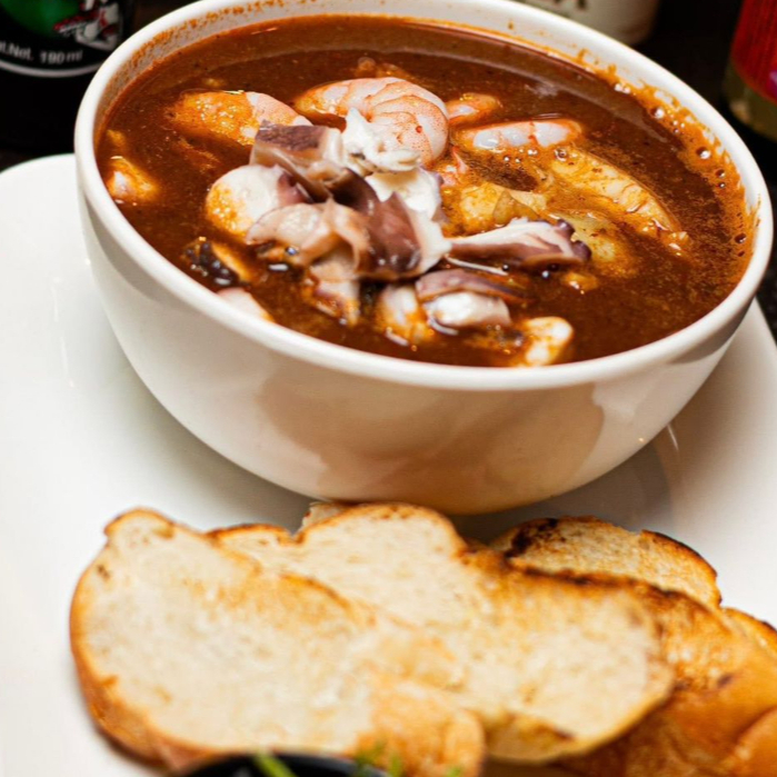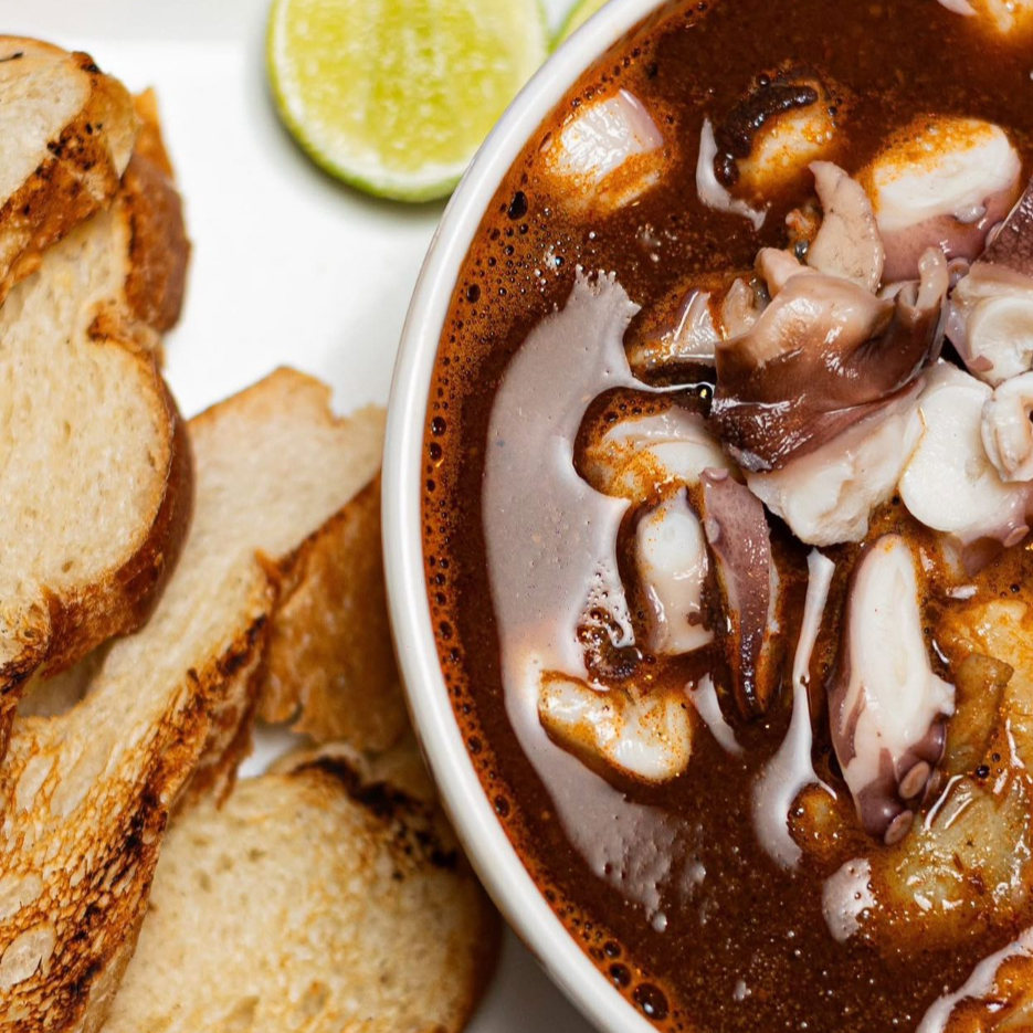 Camarón, Pulpo, Pescado, acompañado de arroz, Pan, Cebolla, Cilantro