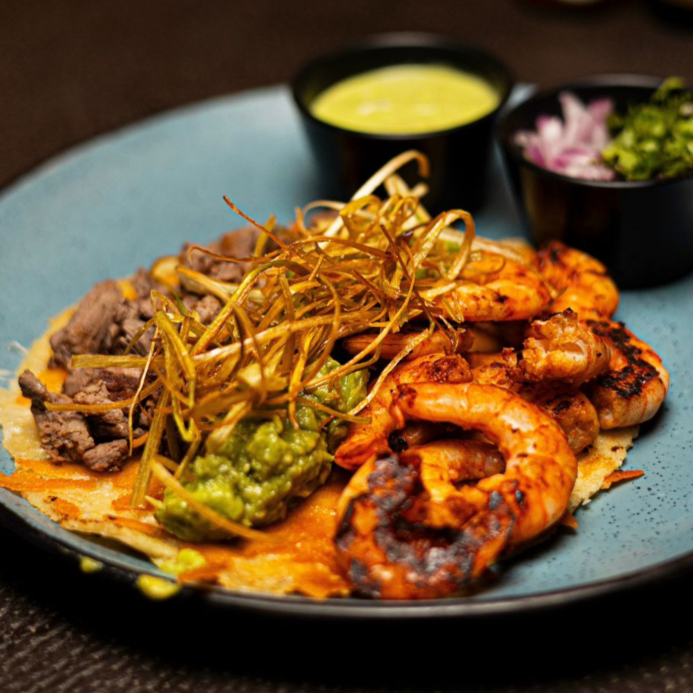 De camarón, Arrachera y guacamole, Servido con poro frito, cilantro y acompanado de pico de gallo