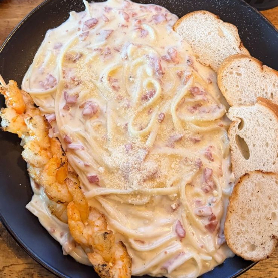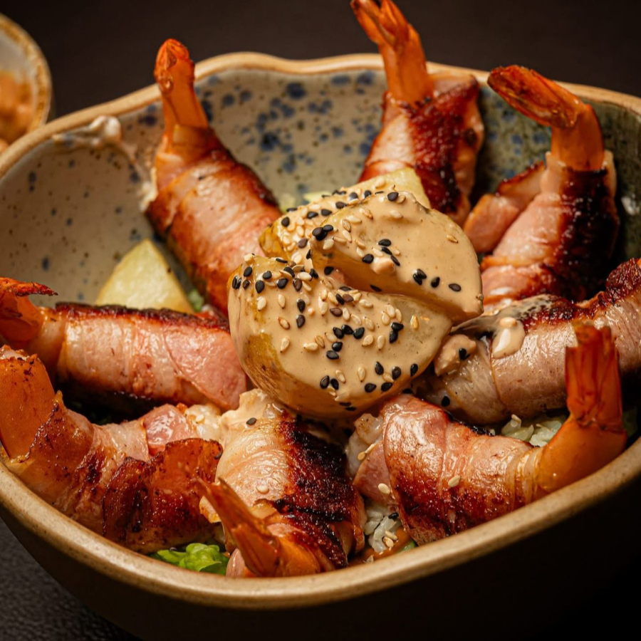 Camarones envueltos de tocino, rellenos de queso crema, Acompañados de ensalada y papas cambray preparadas