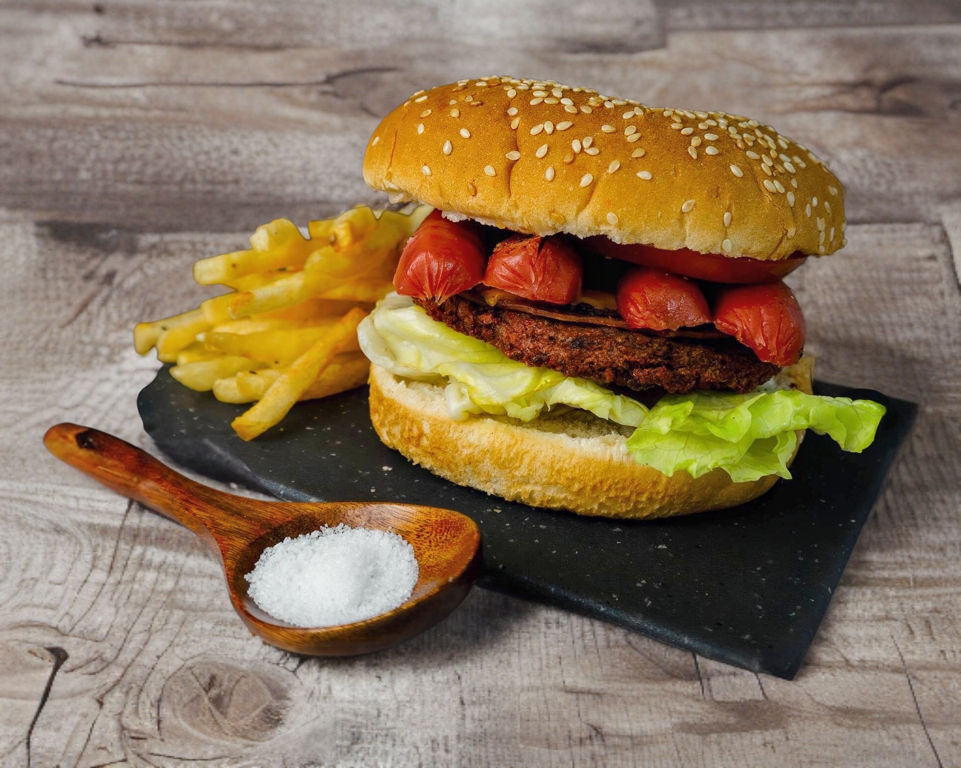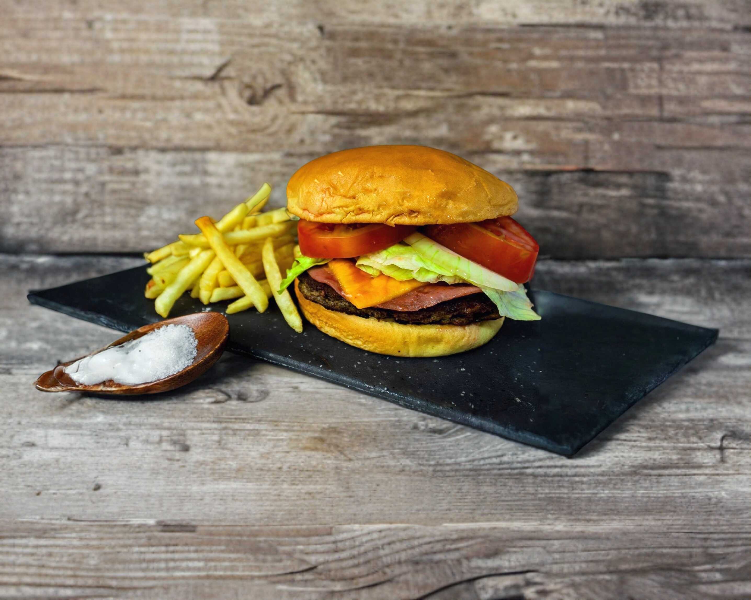 Hamburguesa con 2 salchichas fritas, mayonesa, mostaza, catsup, lechuga romana, tomate, cebolla y porción de papas.