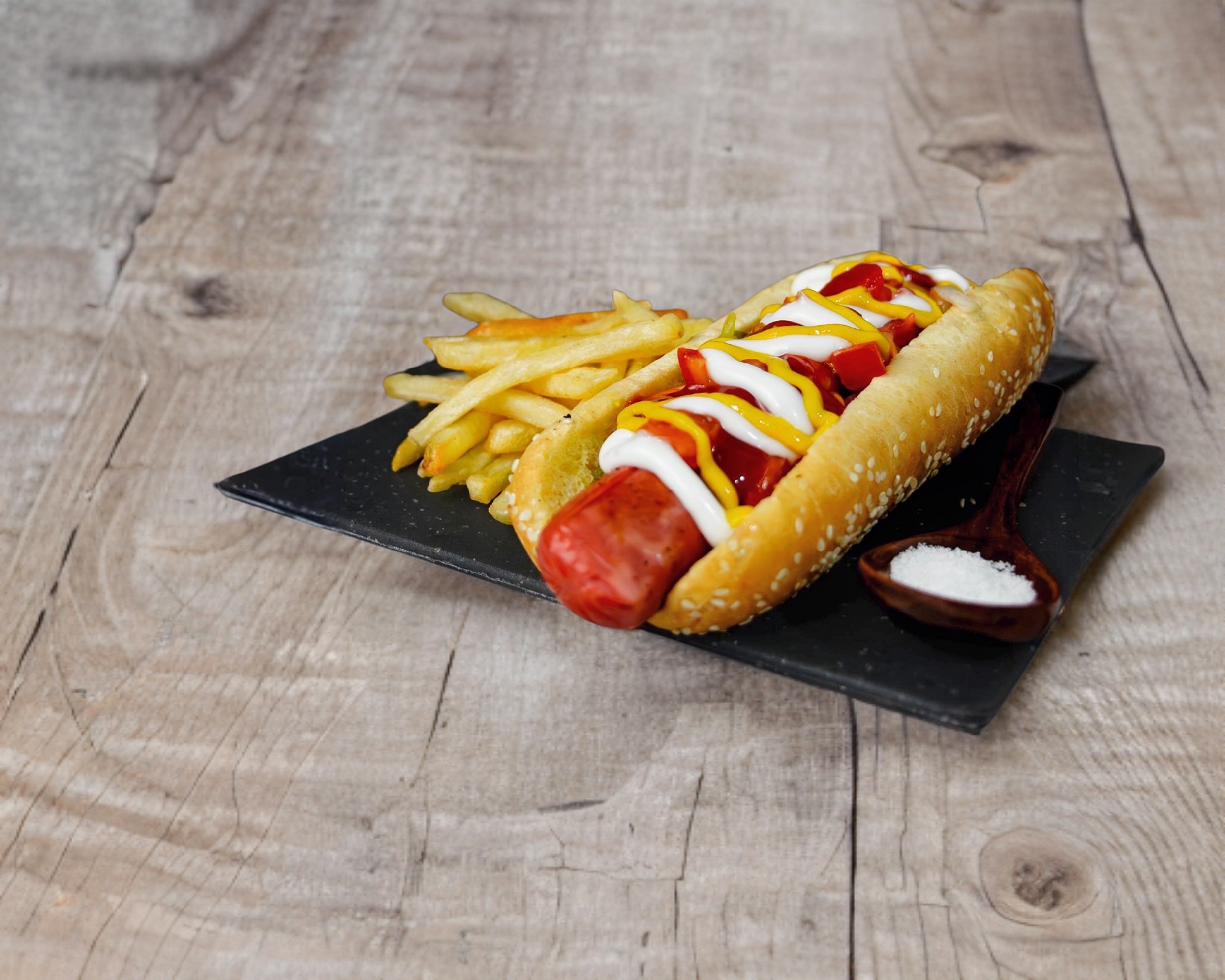 Hot dog salchicha jumbo, mayonesa, mostaza, catsup, tomate, cebolla y chile jalapeño y porción de papas lisas.