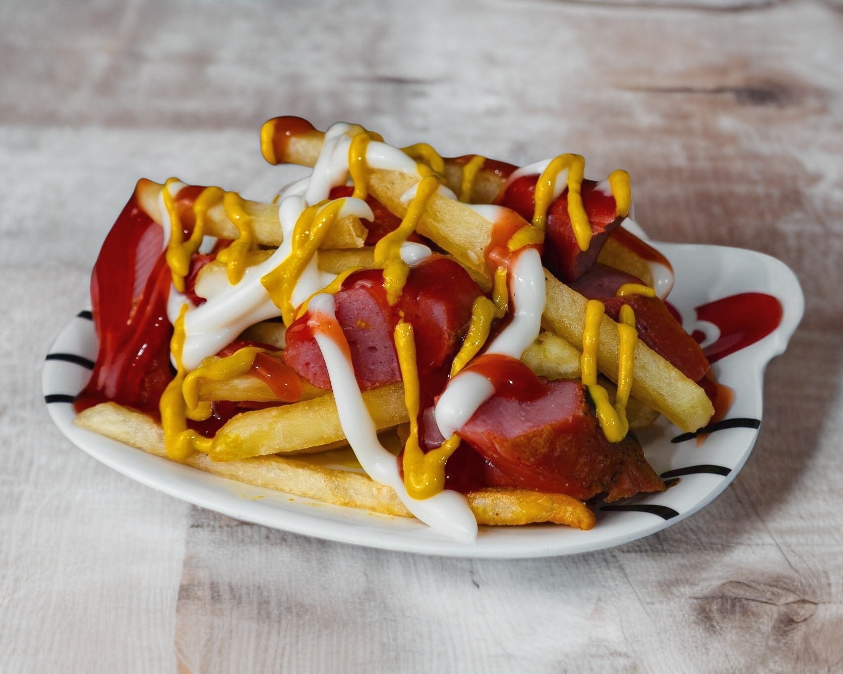 Trocitos de salchicha con papas a la francesa.