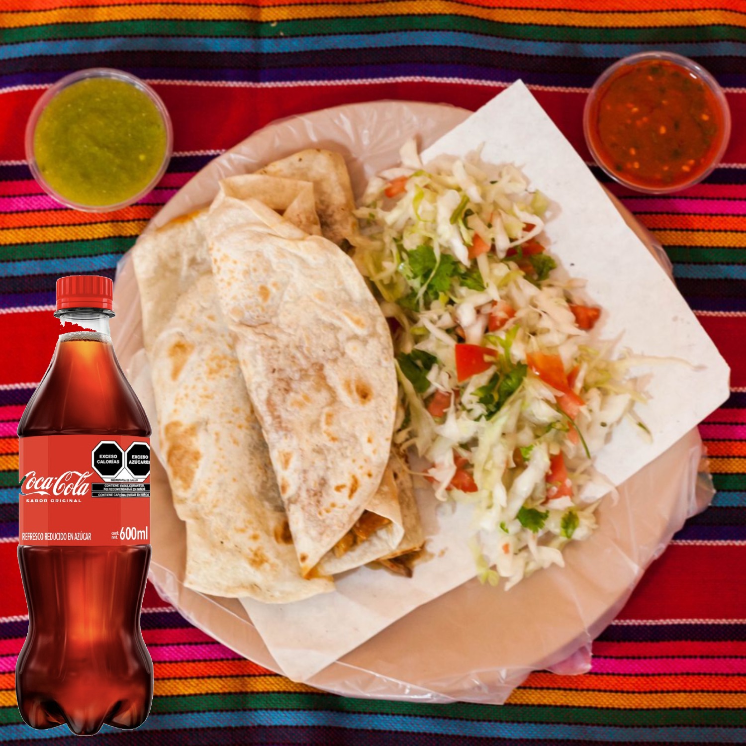 Deliciosa Quesadilla grande con el guiso que desees, acompañada de una Coca Cola.
