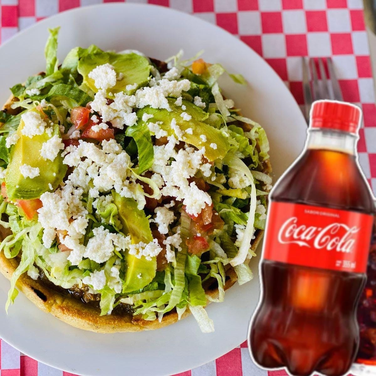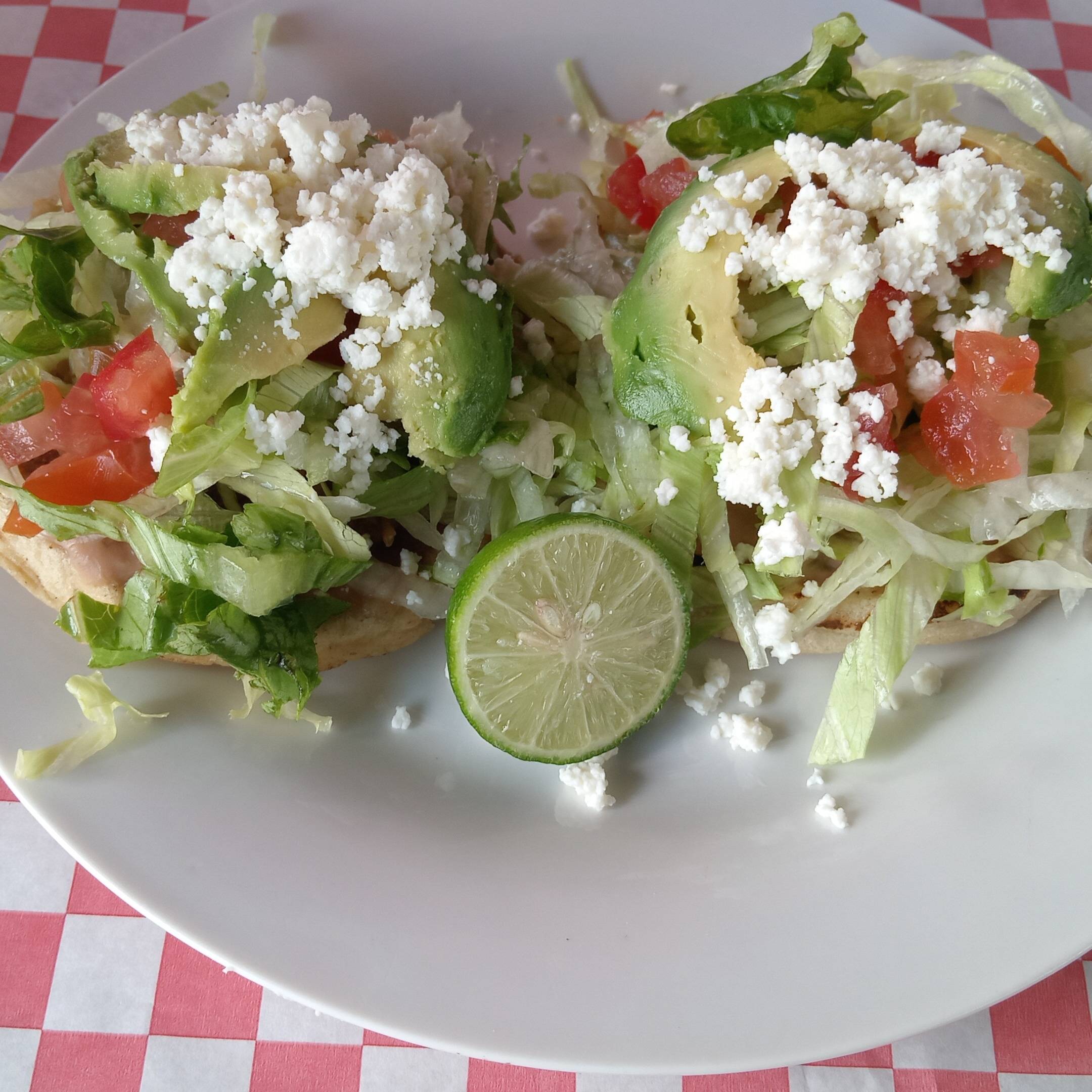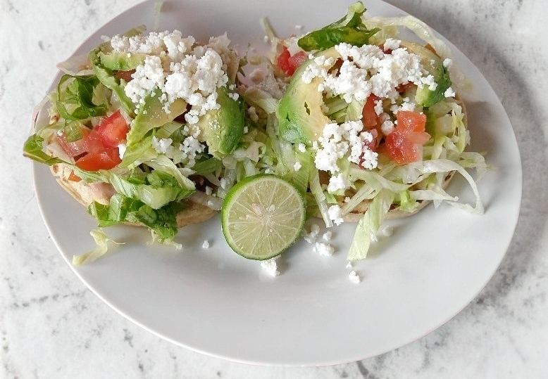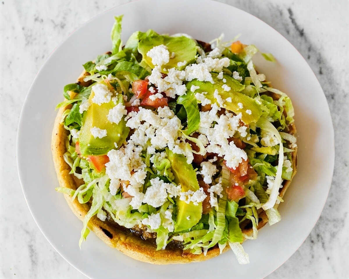 Sope de 10 cm, con una base de frijoles, 1 guiso de tu preferencia, con lechuga, tomate, queso fresco, aguacate y crema sin freir.