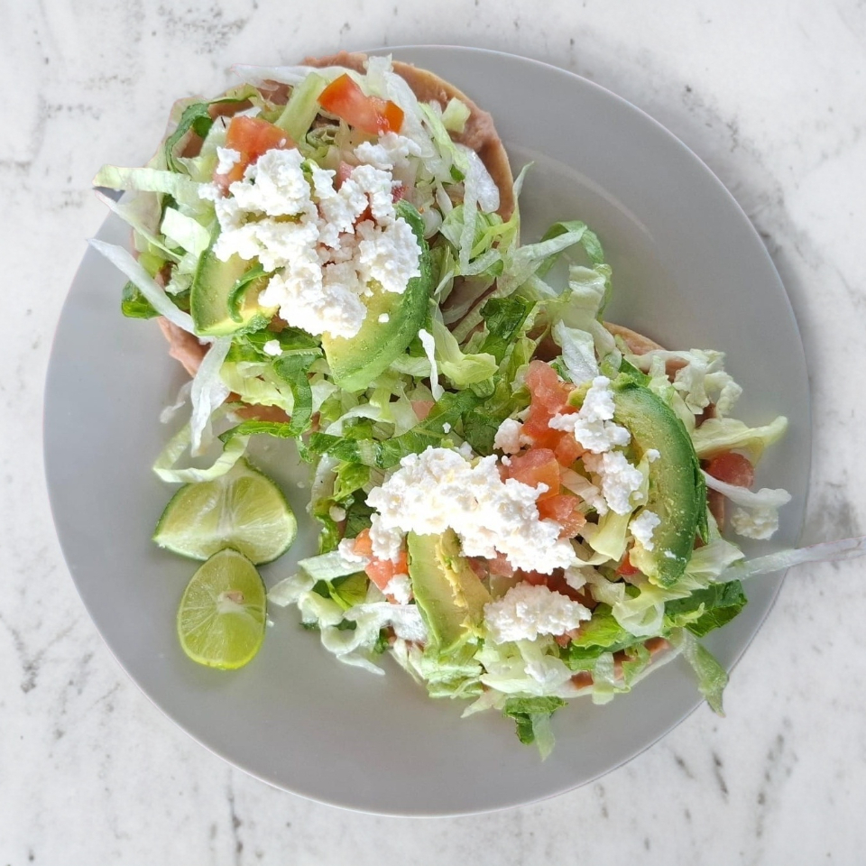 Tostada con una base de frijole,s con 1 guiso de tu preferencia, con lechuga, tomate, queso fresco, aguacate y crema opcional.