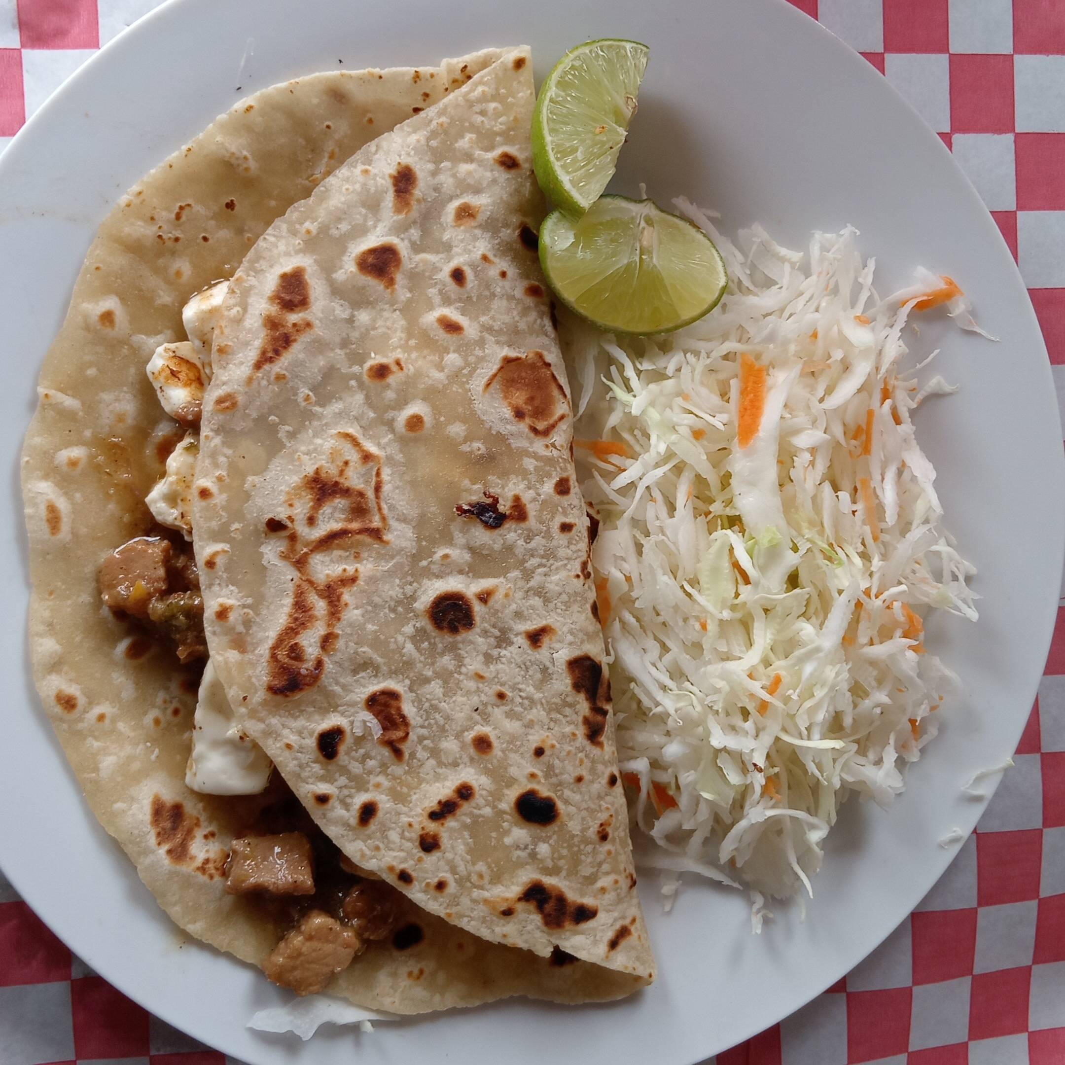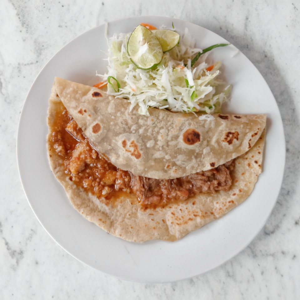 Tortilla casera de 20 cm ,con queso panela y un guiso de tu preferencia.