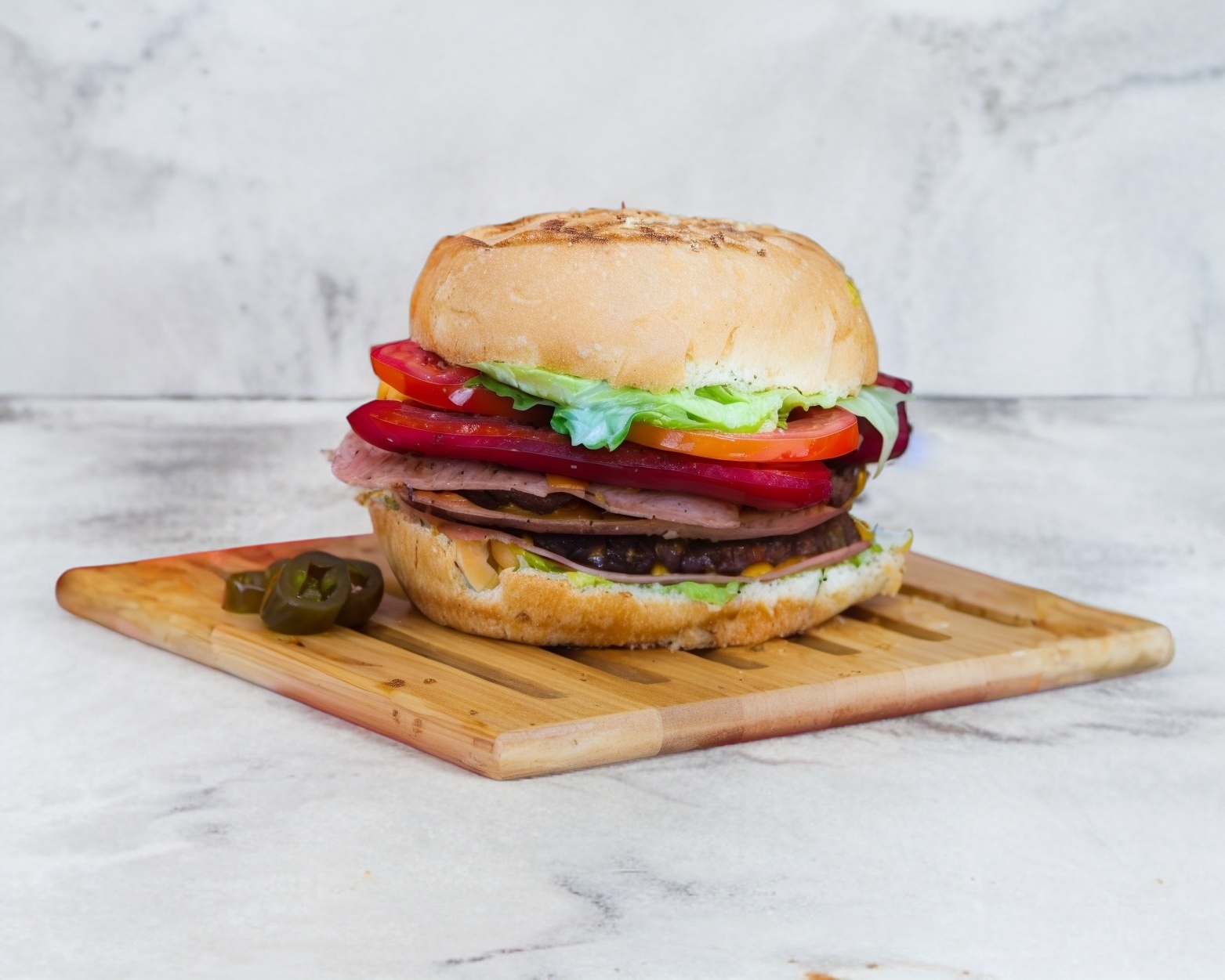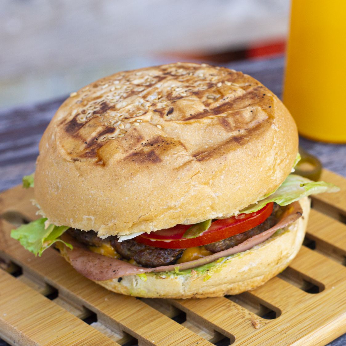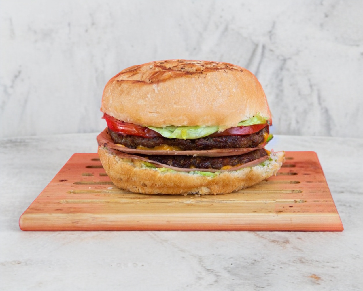 Hamburguesa con doble carne de res, doble jamón, doble queso amarillo, lechuga, tomate, mayonesa y crema de aguacate.