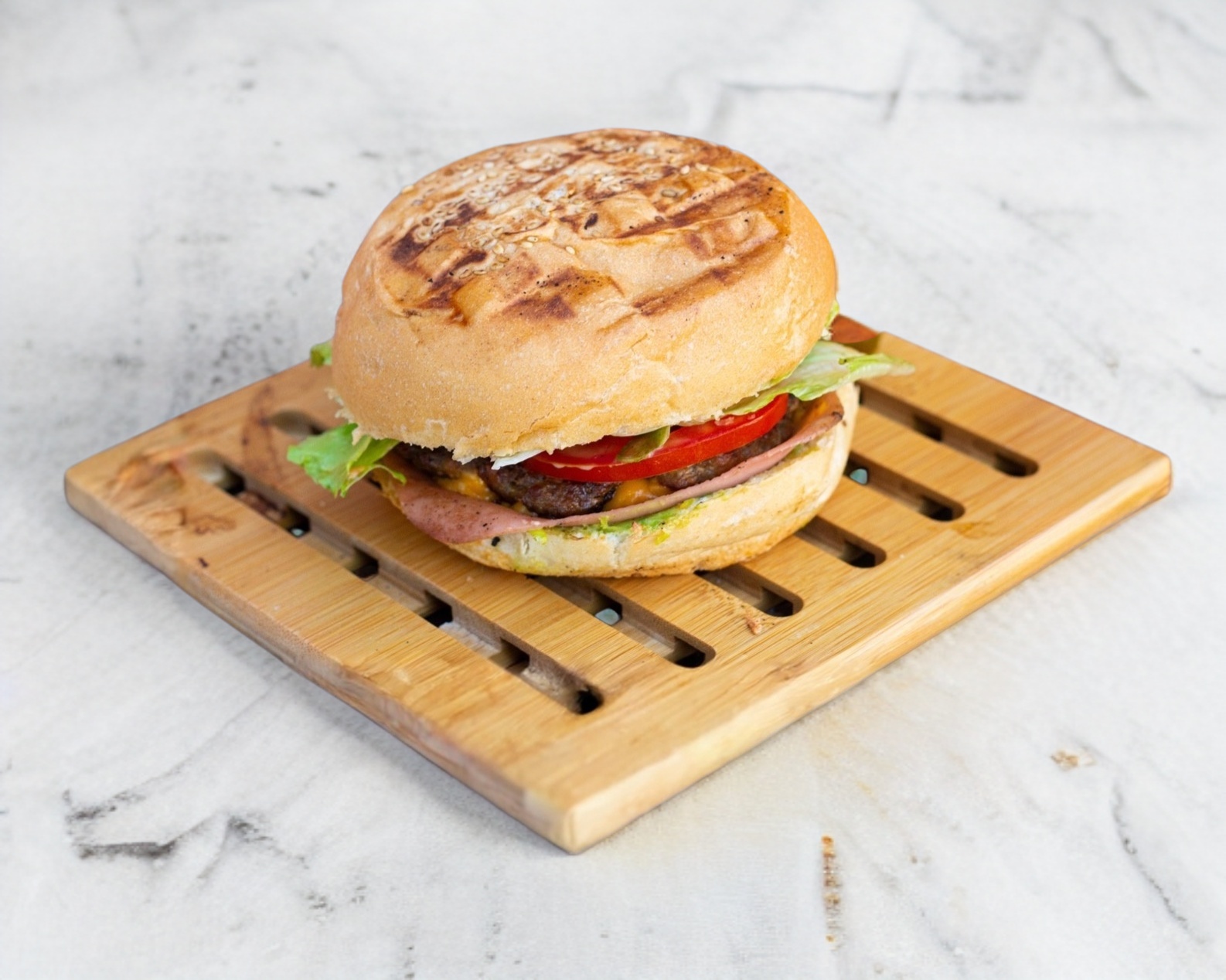 Hamburguesa con carne de res, jamón, queso amarillo, lechuga, tomate, mayonesa y crema de aguacate.