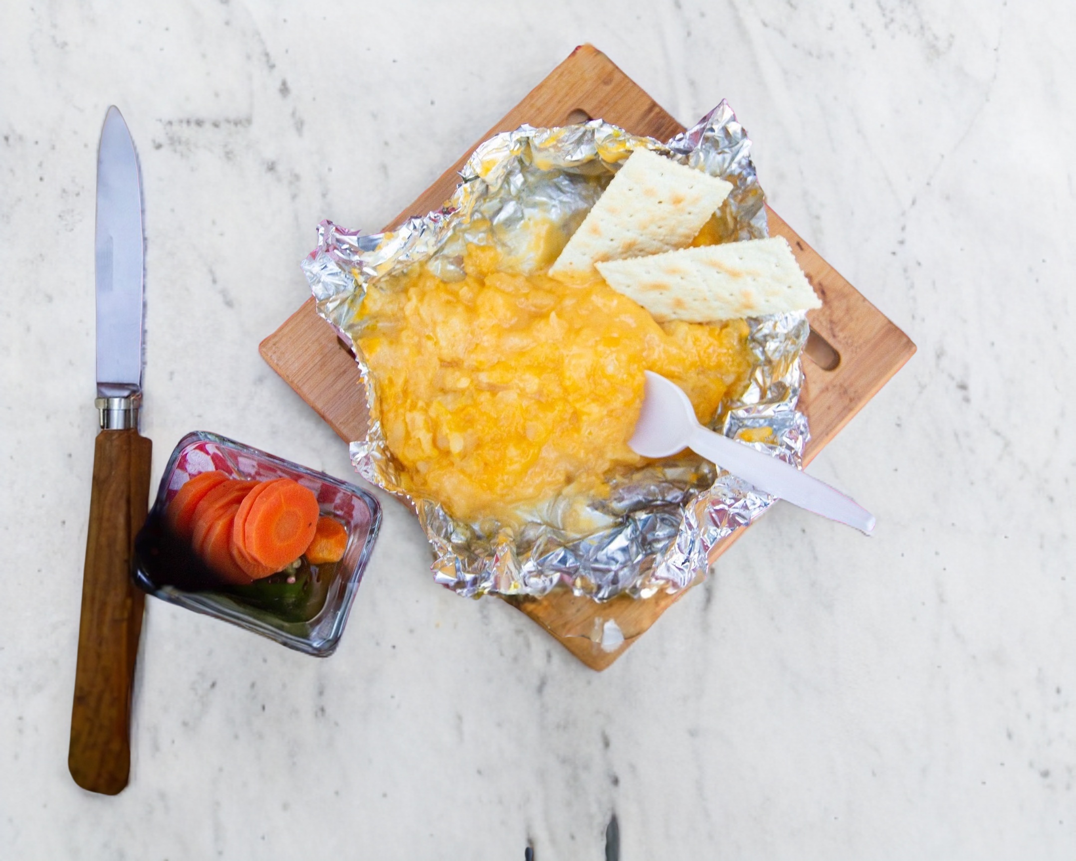 Papa asada con mantequilla y queso amarillo. Acompañado con galletas saladas.