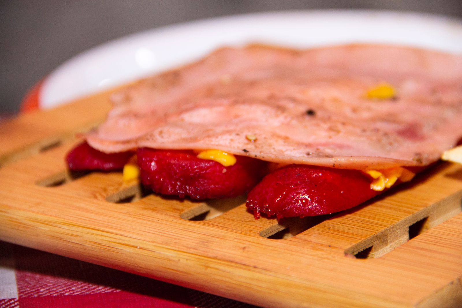 Salchicha para asar con queso y jamón.