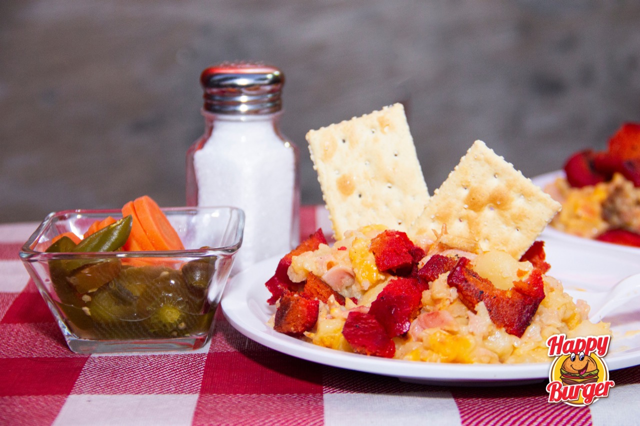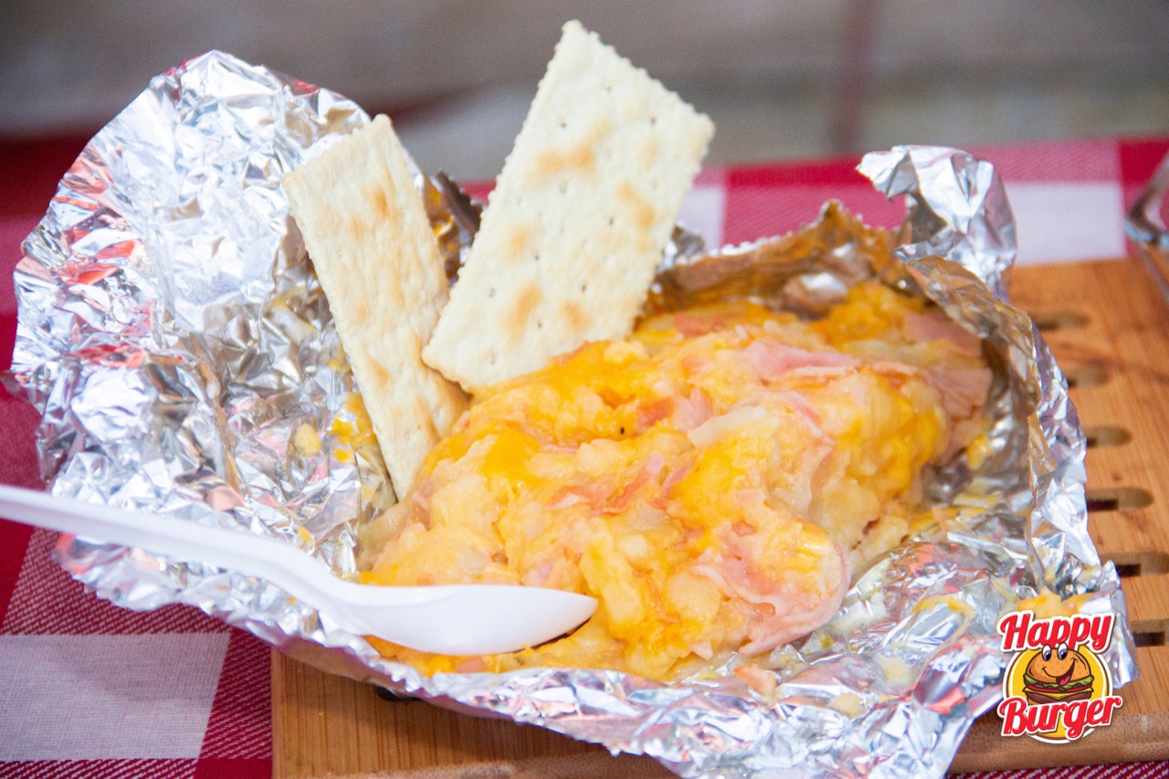 Papa asada con mantequilla, queso amarillo, jamón y carne de hamburguesa. Acompañado con galletas saladas.