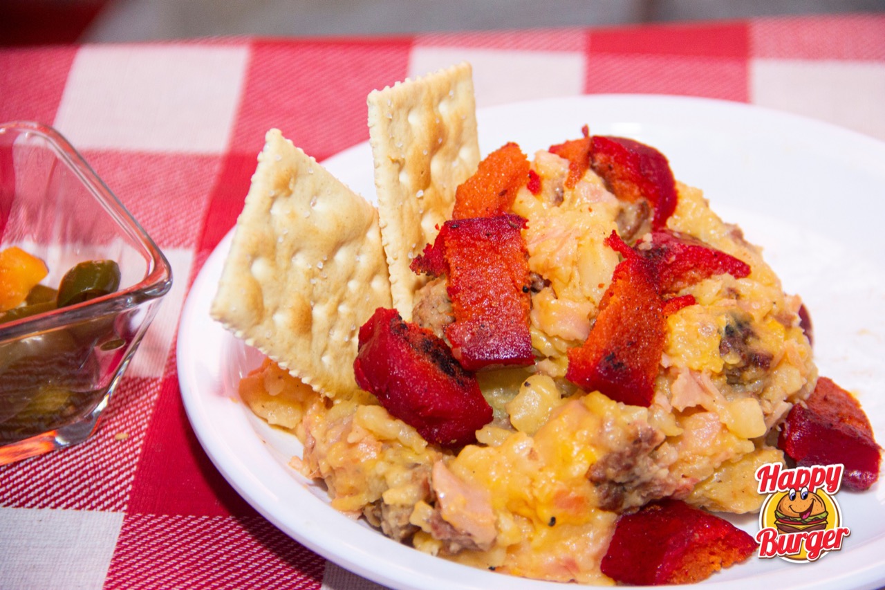 Papa asada con mantequilla, queso amarillo, jamón, carne de hamburguesa y salchicha para asar. Acompañado con galletas saladas.