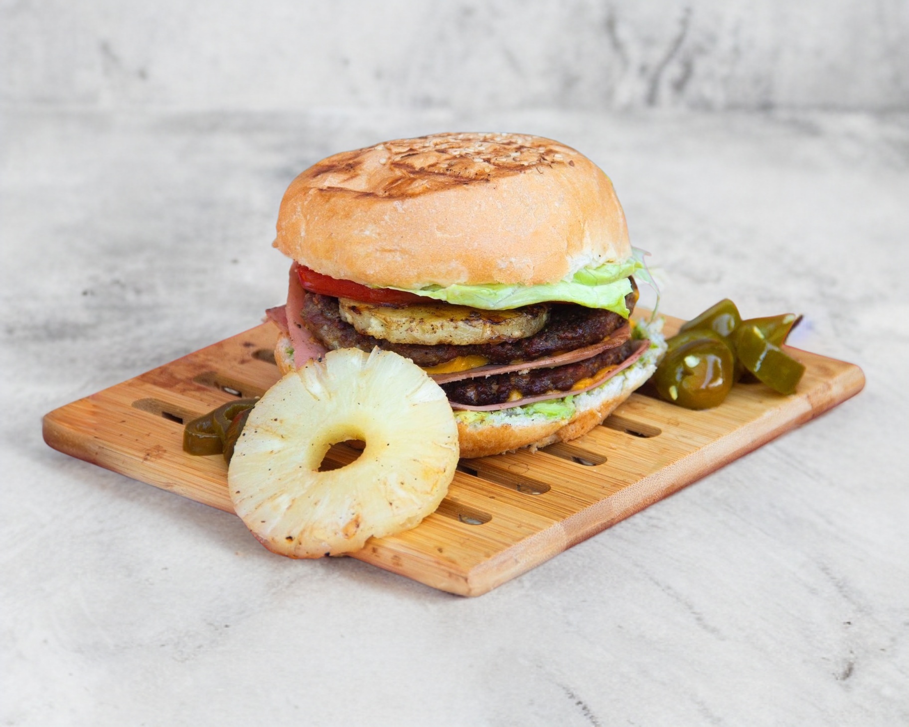 Hamburguesa con doble carne de res, piña, doble jamón, doble queso amarillo, lechuga, tomate, mayonesa y crema de aguacate.