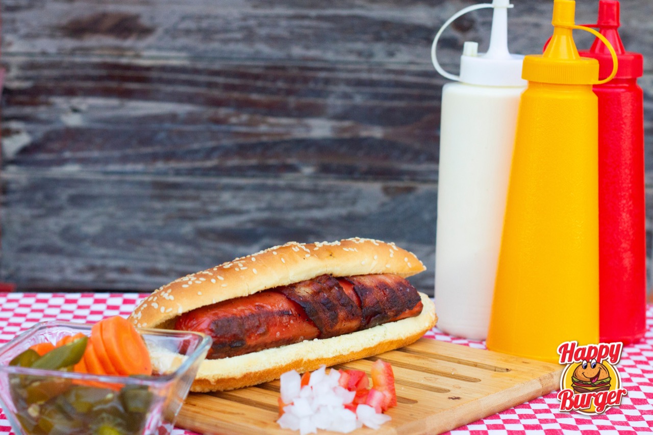 Hot dog con salchicha tamaño jumbo, tocino, mayonesa, cátsup, mostaza, tomate y cebolla.