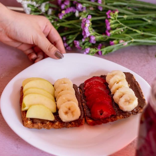 Pan tostado con 2 frutas a elegir: fresa, plátano o manzana. Le pones crema de avellana, crema de cacahuate o mermelada light… ¡y listo para disfrutar!