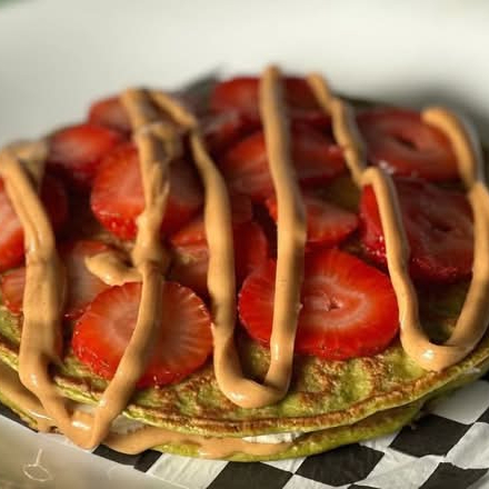 Pancakes de avena natural con granola y miel, más tus 2 frutas favoritas: fresa, plátano o manzana. ¿Quieres subirle el nivel? Agrega crema de avellana o crema de cacahuate